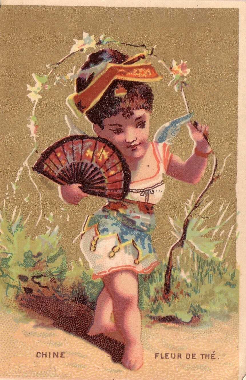 Front: A Woman is dressed in a white dress with a red border design that falls above her knees. Attached around her hips is a blue, green, and yellow apron. She is holding a Chinese embroidered fan and a blue jay bird is perched on her right shoulder. An vine like flower shroub surrounds her. Near the bottom of the tradecard is the following notation: Chine Fleur De The.