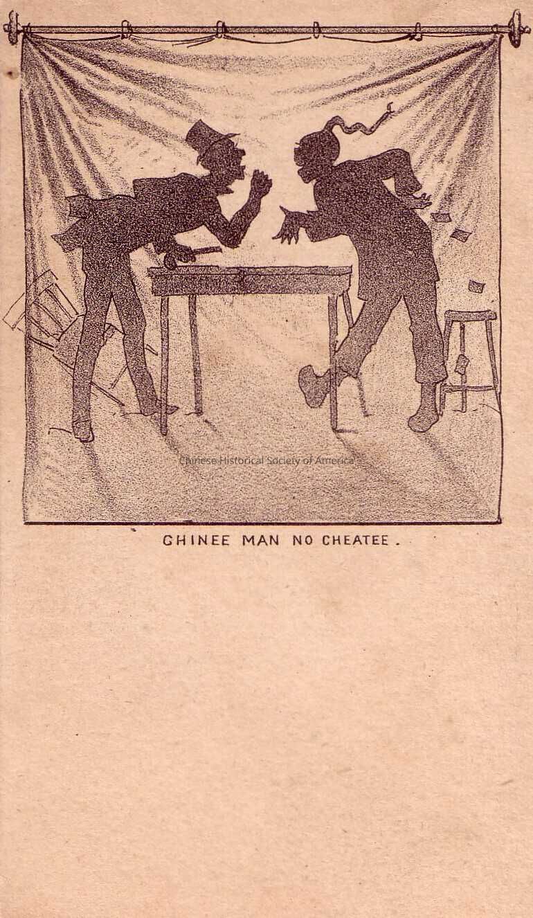 Front: With a sheet/curtain casting over two figures, the shadow of two people can be seen. Seen in the shadows are two men arguing. On the left is a western man wearing a suit and top hat arguing and in a fighting stance with his chair kicked out and falling back. To the right is a Chinese man with a queue who is arguing back. His stool is pushed back and with one hand behind him, he is releasing/hiding four playing cards.