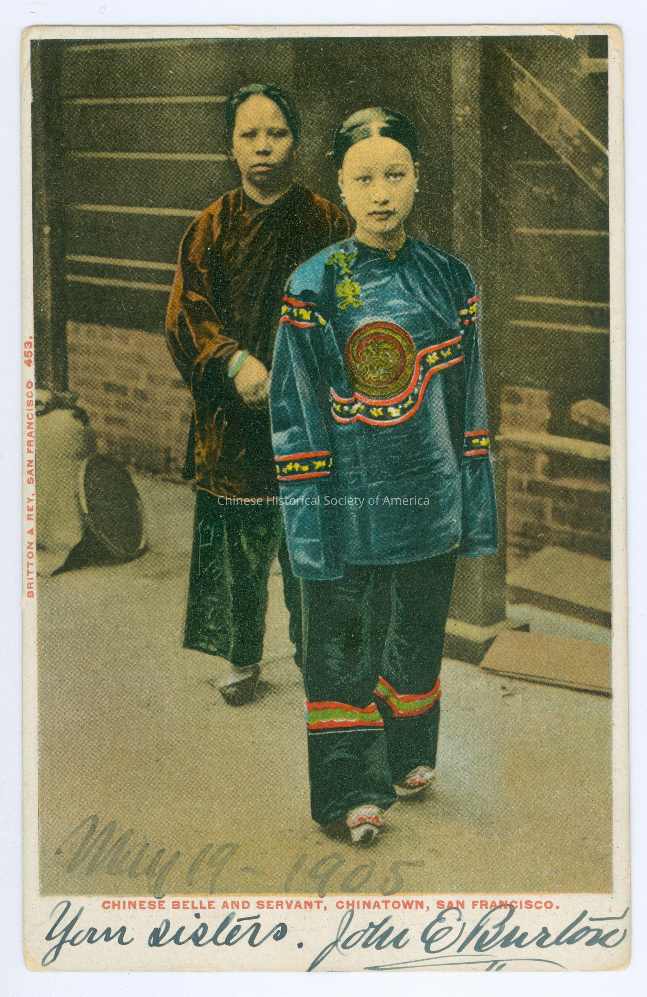 Front: Caption: "Chinese Belle and Servant, Chinatown, San Francisco." Message: "Your Sisters. john E. Burton", handwritten in black. "Britton & Rey San Francisco 453." Back: Postmark: "San Francisco, Cal. May 19 1905 12:30 PM", stamped in black. Address: "Mrs. John E. Ruilou, Lake Geneva, Wisconsin."