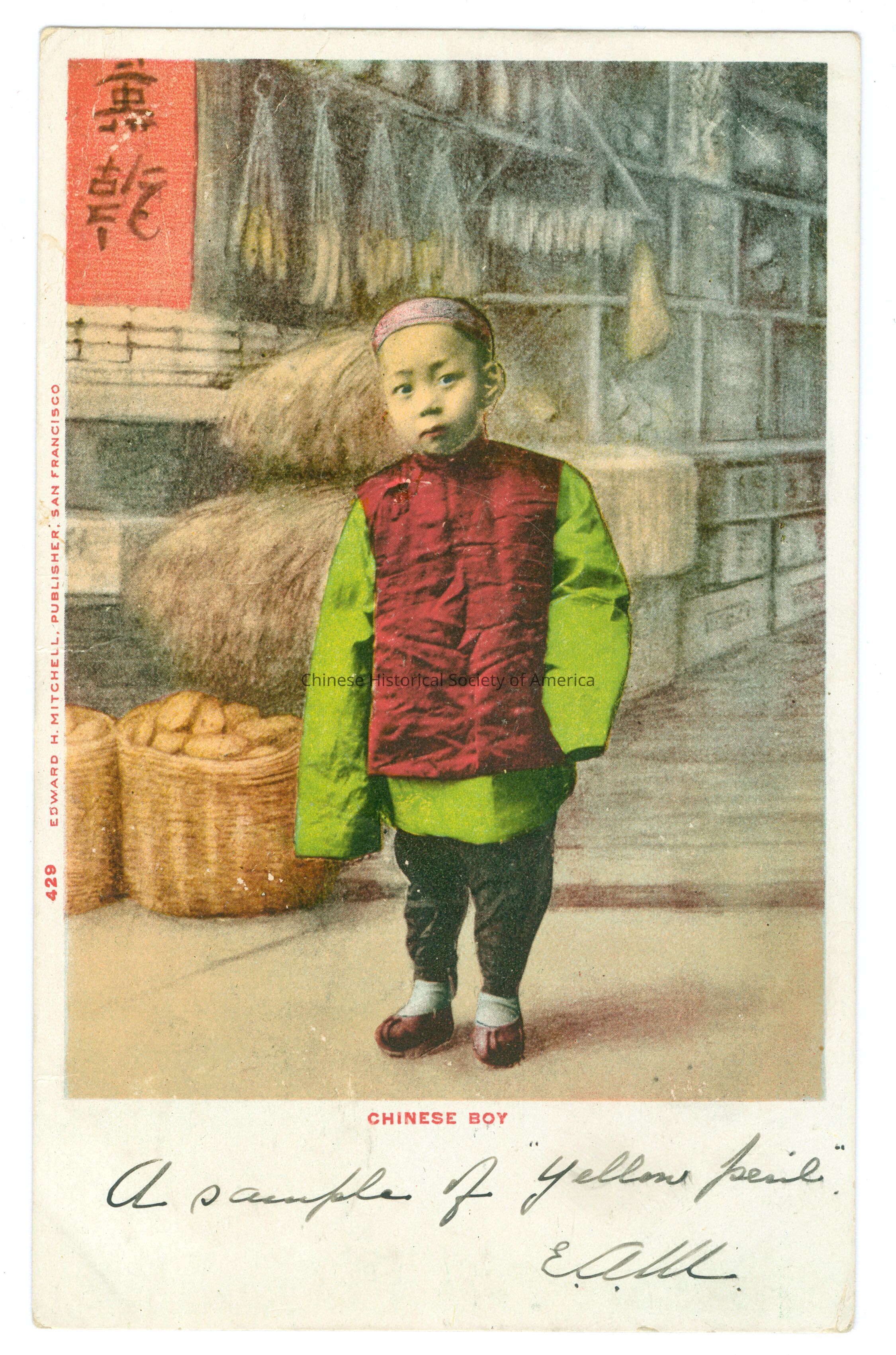 Color. Photo. SF; Children: A Chinese boy wearing a hat with a red vest and green long undershirt is standing on the sidewak in front a store that has baskets of food on the floor and hanging bananas in the background. Front: Caption: "Chinese Boy." Message: "A sample of 'Yellow Peril' [EAW]", handwritten in black. "429 Edward H. Mitchell, Publisher, San Francisco." Back: Postmark: "Victoria, B.C., Canada, Jun 18, 18 06", stamped in black. Address: "Miss K.A.Dimensions
