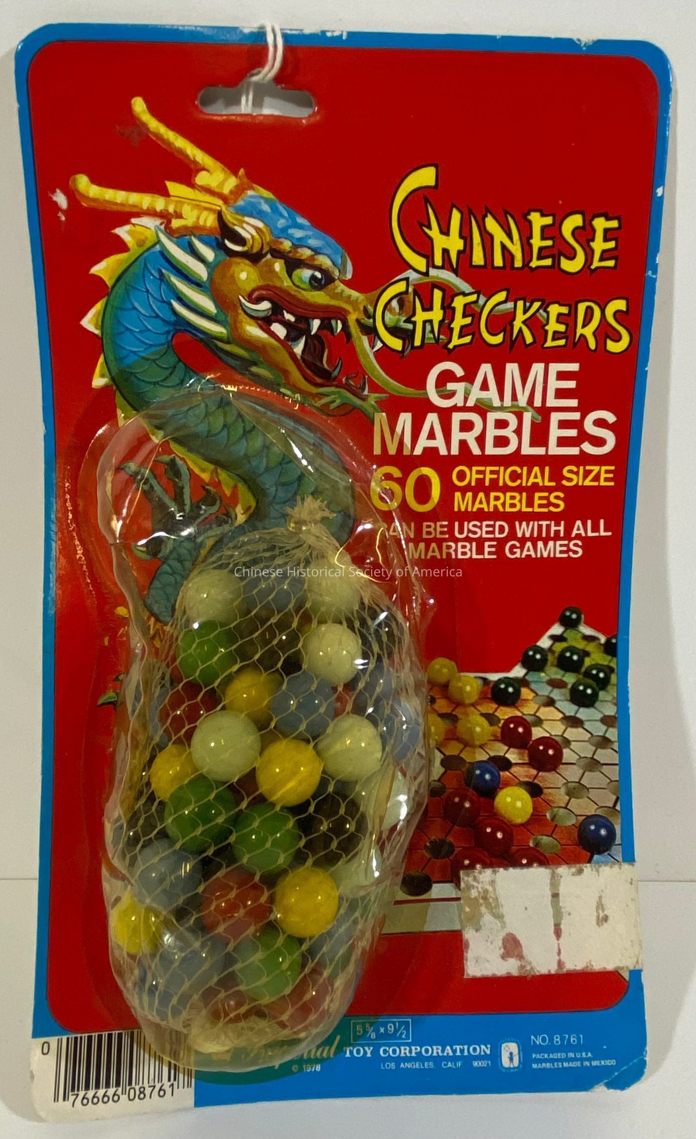 Various colored marbles in original package. The package features an illustration of a dragon and a picture of a Chinese Checker game board with marbles on top of a red and blue background. Near the bottom, the package reads, "Imperial Toy Corporation [copyright] 1978 Los Angeles, Calif, 90021, No. 8761, Packaged in USA, marbles made in Mexico, 5 5/8" x 9 1/2". The marbles are wrapped in plastic and inside a plastic-mesh bag.
