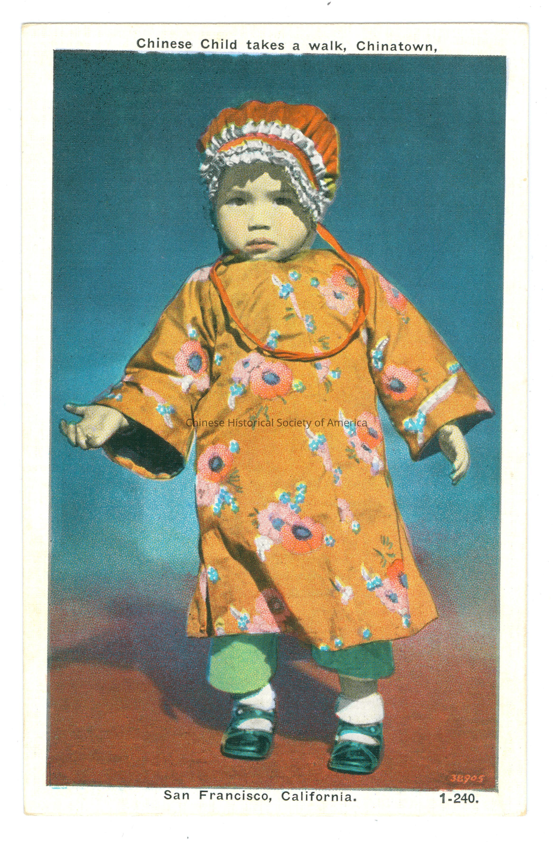 Front: Caption: "Chinese Child takes a walk, Chinatown.; San Francisco, California. 1-240." "38905." Back: Info. Text: "A Chinese child takes a walk. In Chinatown the children are costumed both in American style and Chinese garb." "Pacific Novelty Co. San Francisco and Los Angeles."