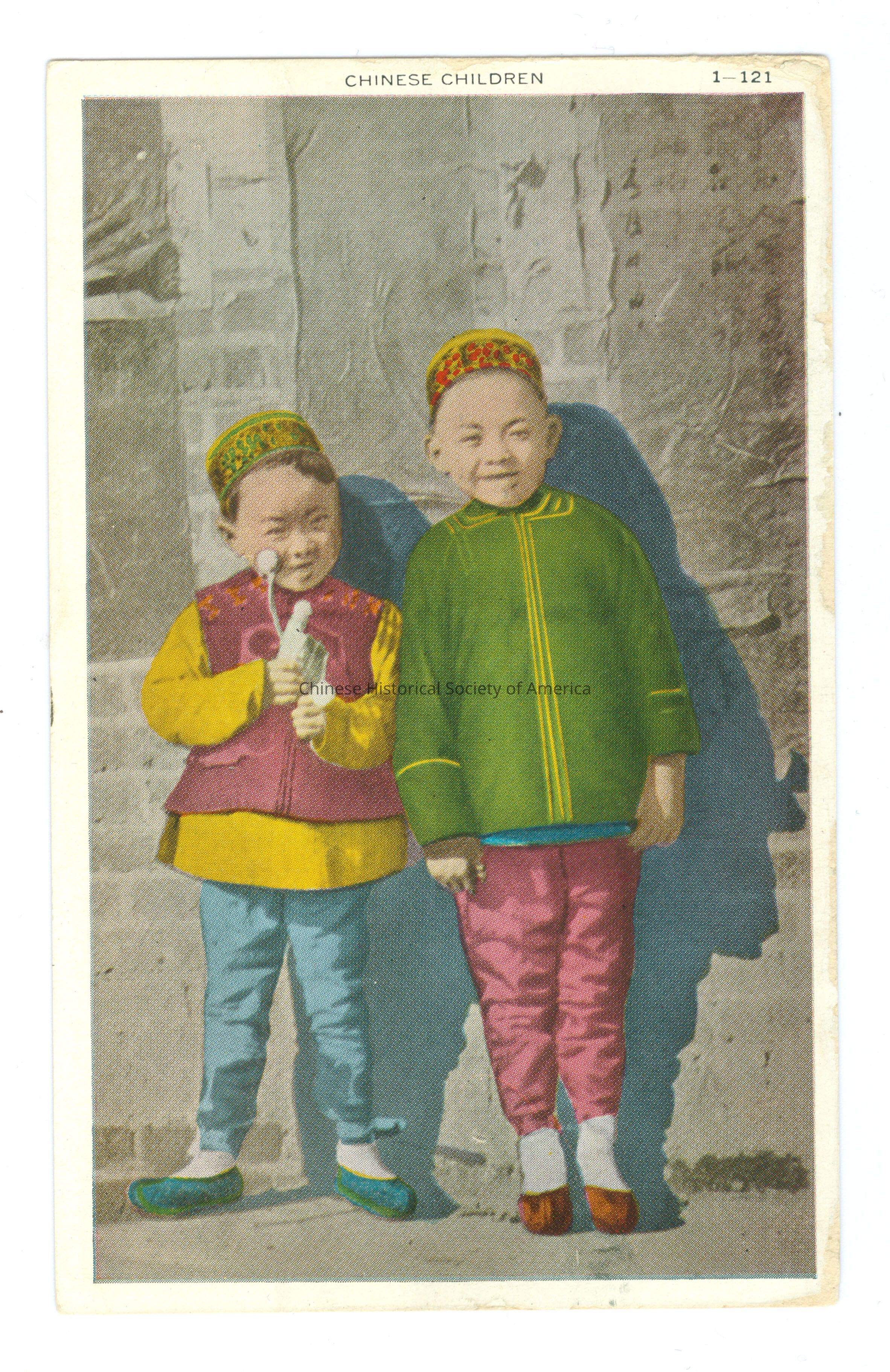 Color. Photo. SF; Children: 2 Chinese boys both wearing hats, one in red and yellow the other in green and red, standing outside leaning against the wall, the smaller boy is holding a "toy" in his hands.