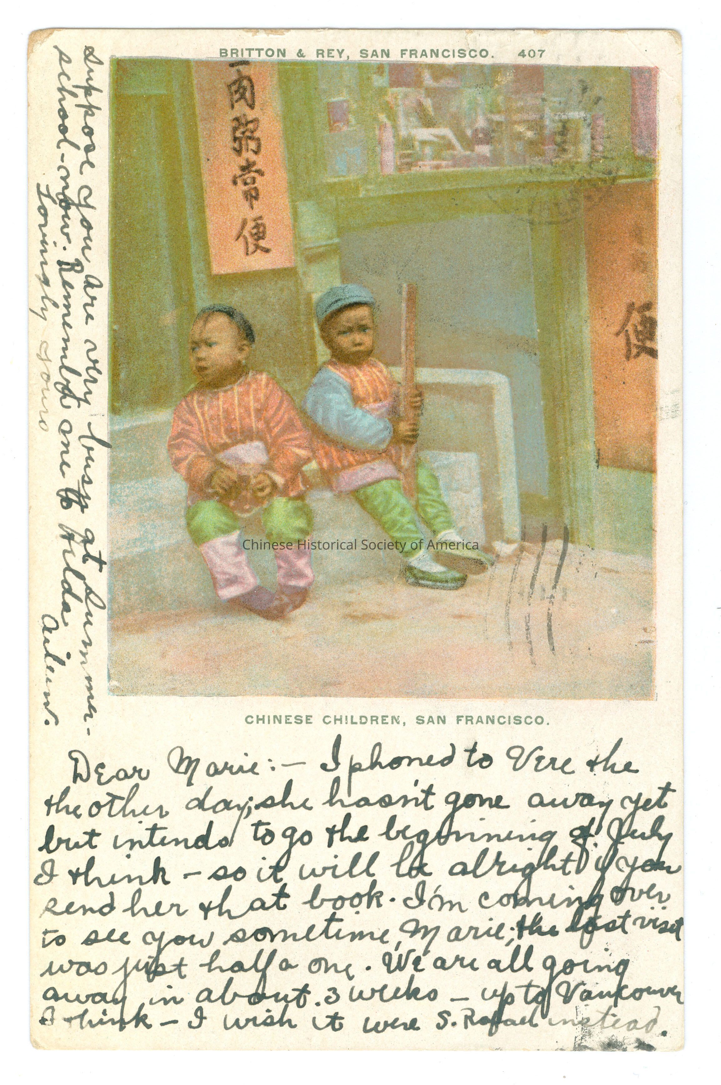 Front: Caption: "Chinese Children, San Francisco." Message: Talking about a visit to Vancouver. "Britton & Rey, San Francisco. 407." Back: Postmark: "San Francisco, Cal. Jun 29 1905 1:30 PM"; "Berkeley, Cal. Jun 29 1905 5-PM"; "San Francisco, Cal.Dimensions