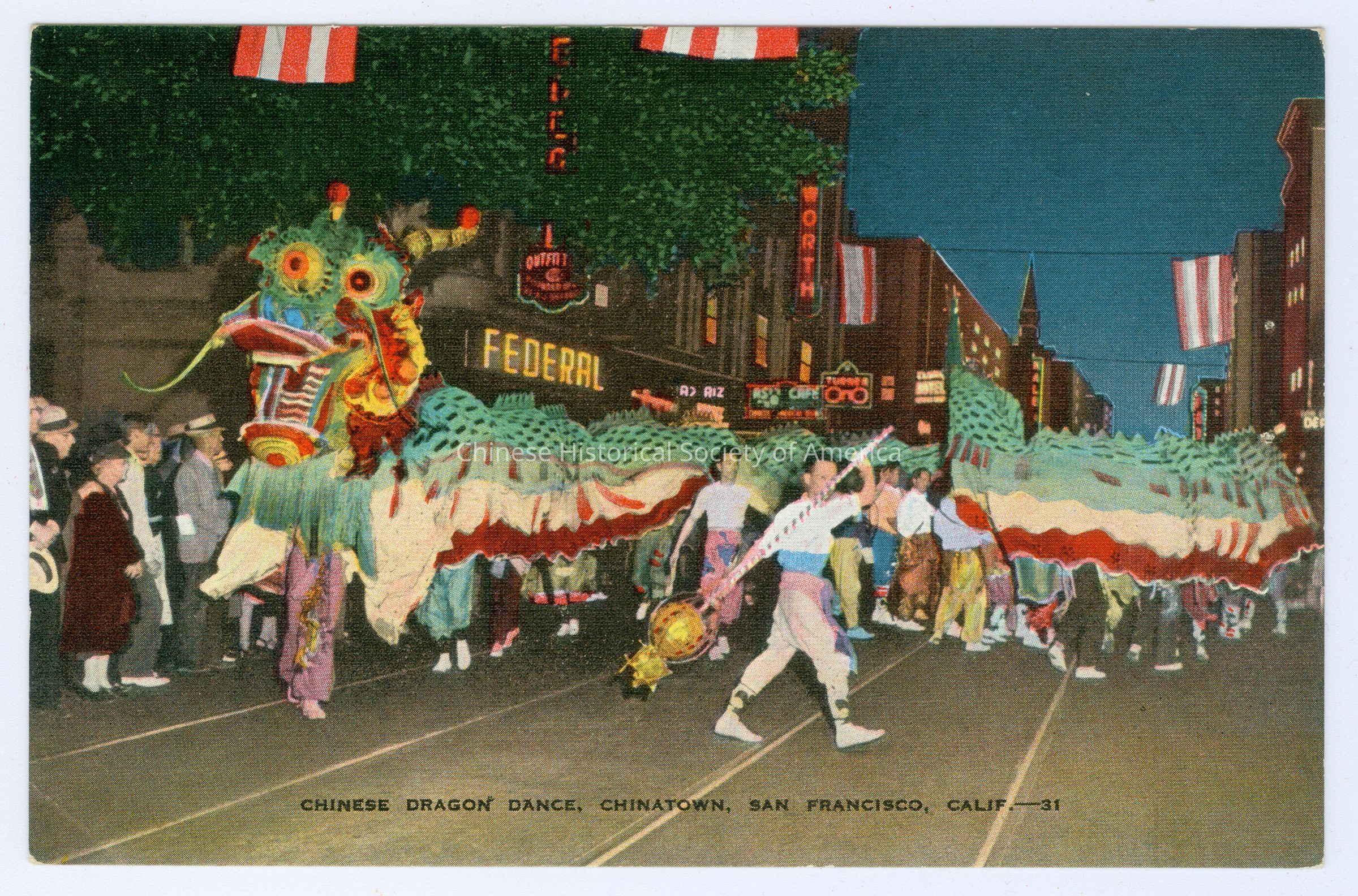 Front: Caption: "Chinese Dragon Dance. Chinatown. San Francisco. Calif.-31." Back: Info. Text: "Chinese New Years', usually in February, lures all of San Francisco's 20,000 Chinese residents for a week long celebration, which includes feasts of the lanterns, religious ceremonies and the famous Dance of the Dragon. The huge silken creature, carried by dozens of young men, parades through the streets of the district, by day and by night."