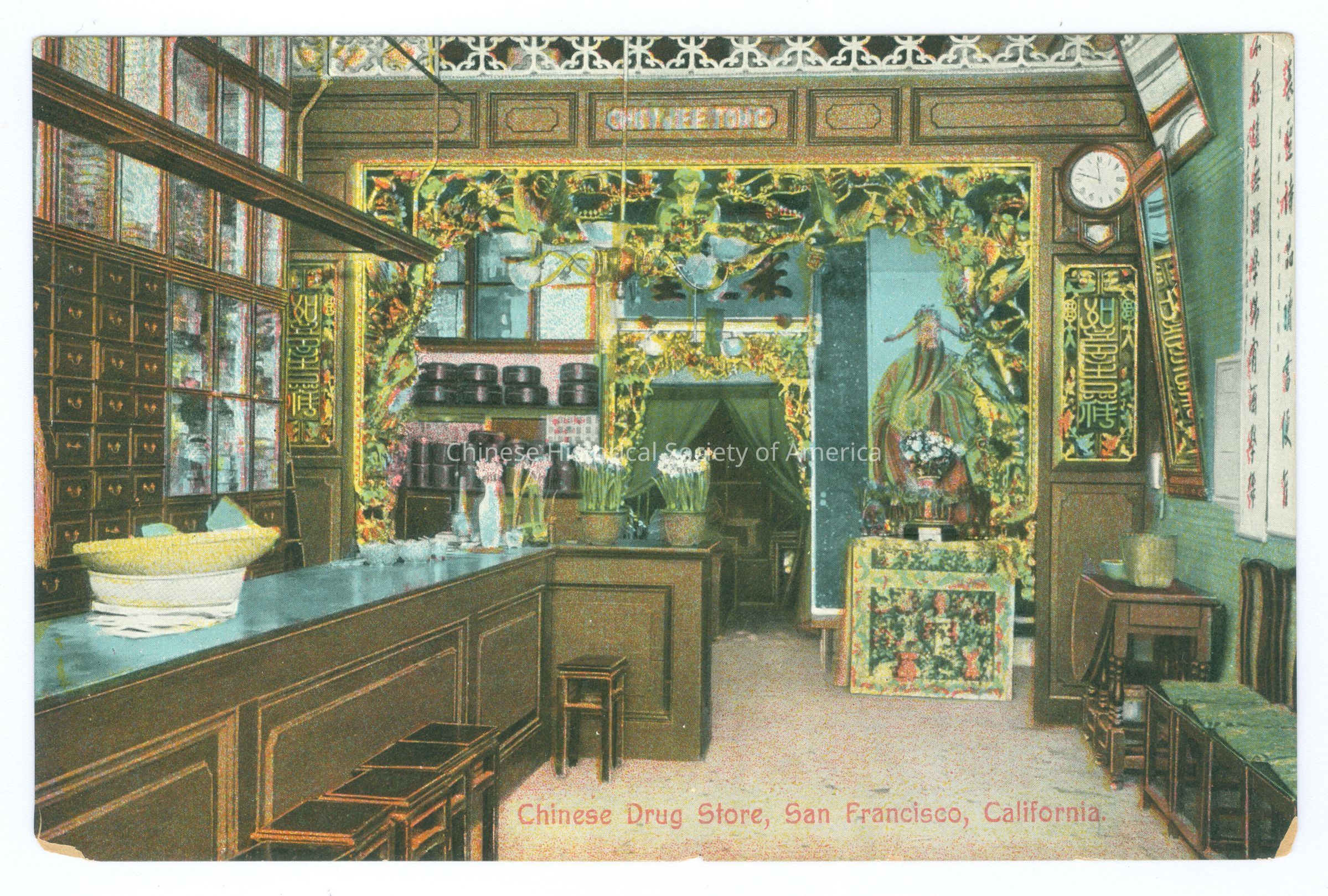Front: Caption: "Chinese Drug Store, San Francisco, California". Back: "Newman Postcard Company". "On the Road of a Thousand Wonders." "No. V. 222." Old Accession #: AEX