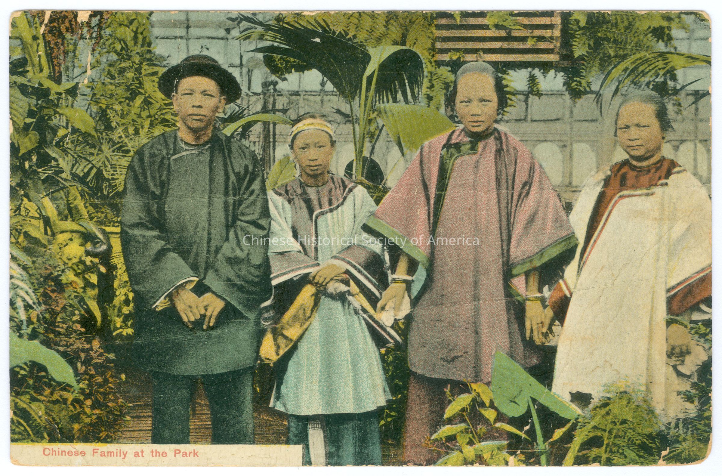 Front: Caption: "Chinese Family at the Park." Back: Postmark: Illegible. Stamp: A green one cent stamp with a side picture of Benjamin Franklin, "U.S. Postage, One Cent." Address: "Mrs G. Pleasiance 379 N. Bunkerhill Los Angeles CAl.", handwritten in blue. Message: "San Miguel. My Dear Friends we arrived all OK, __come all night. I was so sorry that we could not call to see you before we left. How are you all? how is the ____" handwritten in blue. Old Accession #: DAE