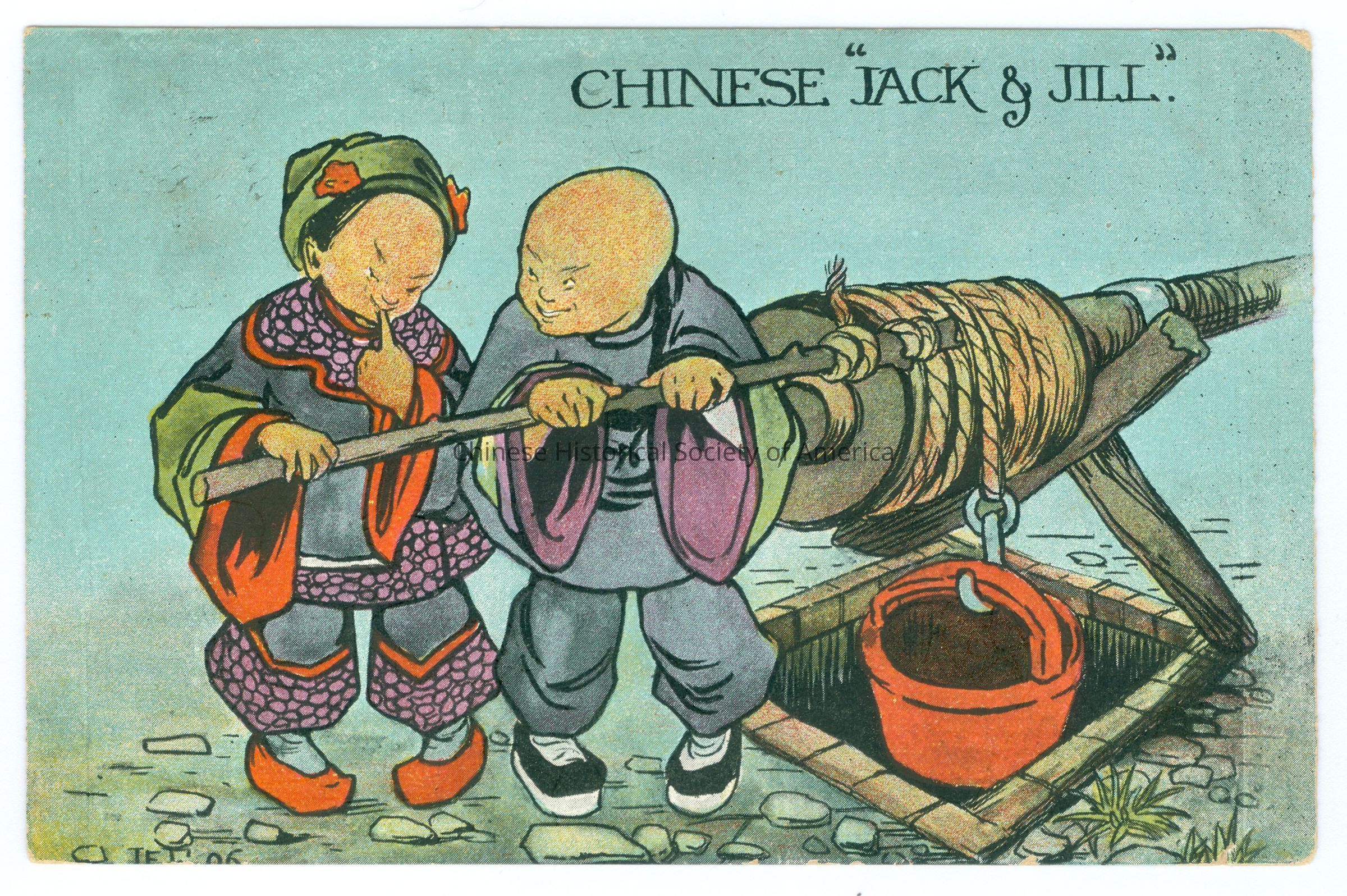 See CHSA-04922-04926. Front: Caption: "Chinese "Jack & Jill"; "LEF.06." Back: Postmark: "Pleasant Hill MO. Aug 8 1910 4 PM", stamped in black. Stamp A green one cent stamp with a side picture of Benjamin Franklin, "U.S. Postage, One Cent." Message: "Aug 6 1910, Will answer upir card at last I would like to be there to play with you and your dog. Daisy __ and she sits up and just goes a flying she has me - __ felow with soon from you cousin, Martha Frances Kennedy."; "Mr Charles Loyd __, Burdett, Colo. ___ W H __." handwritten in black. Old Accession #: IXG