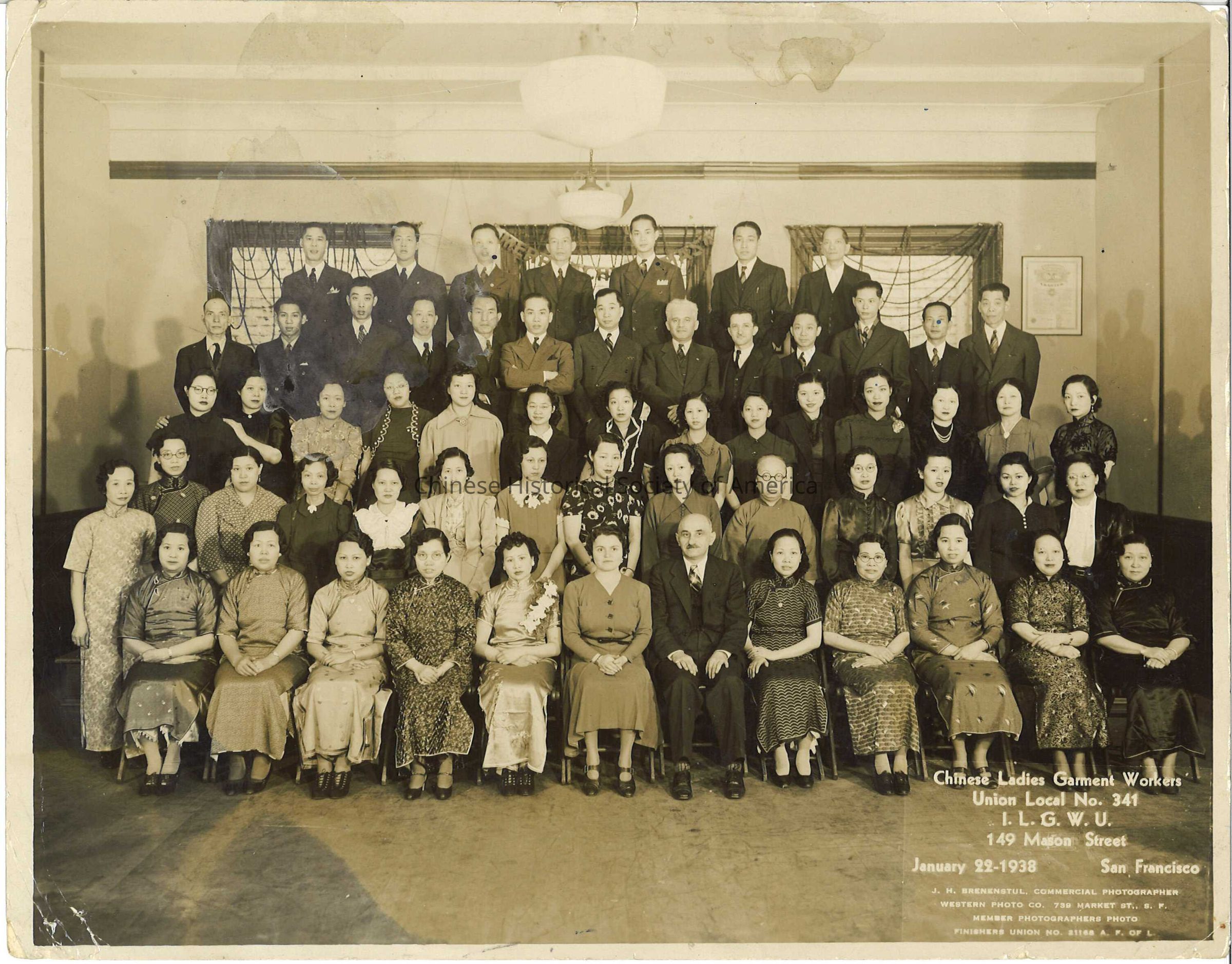 Group Photo labeled: Chinese Ladies Garment Workers Union Local No. 341 I. L. G. W. U. 149 Mason Street January 22-1938 San Francisco. J. H. Brenenstul Studio, San Francisco.Dimensions
