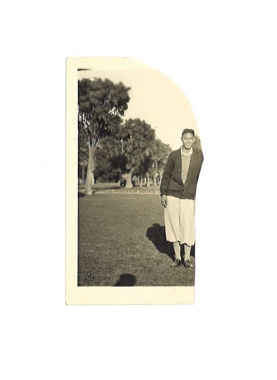 Black and white photo of a Chinese man standing in the grass in a sports outfit. The photo is cropped on the right side.