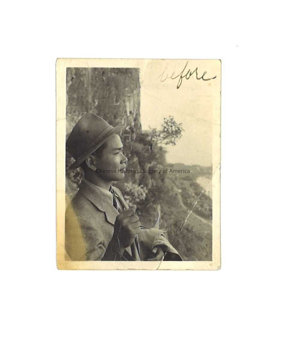 Black and white photo of Chinese man looking outward at cliff of Shi San (West Mountain.) In ink in the corner of photo is the word: "before."