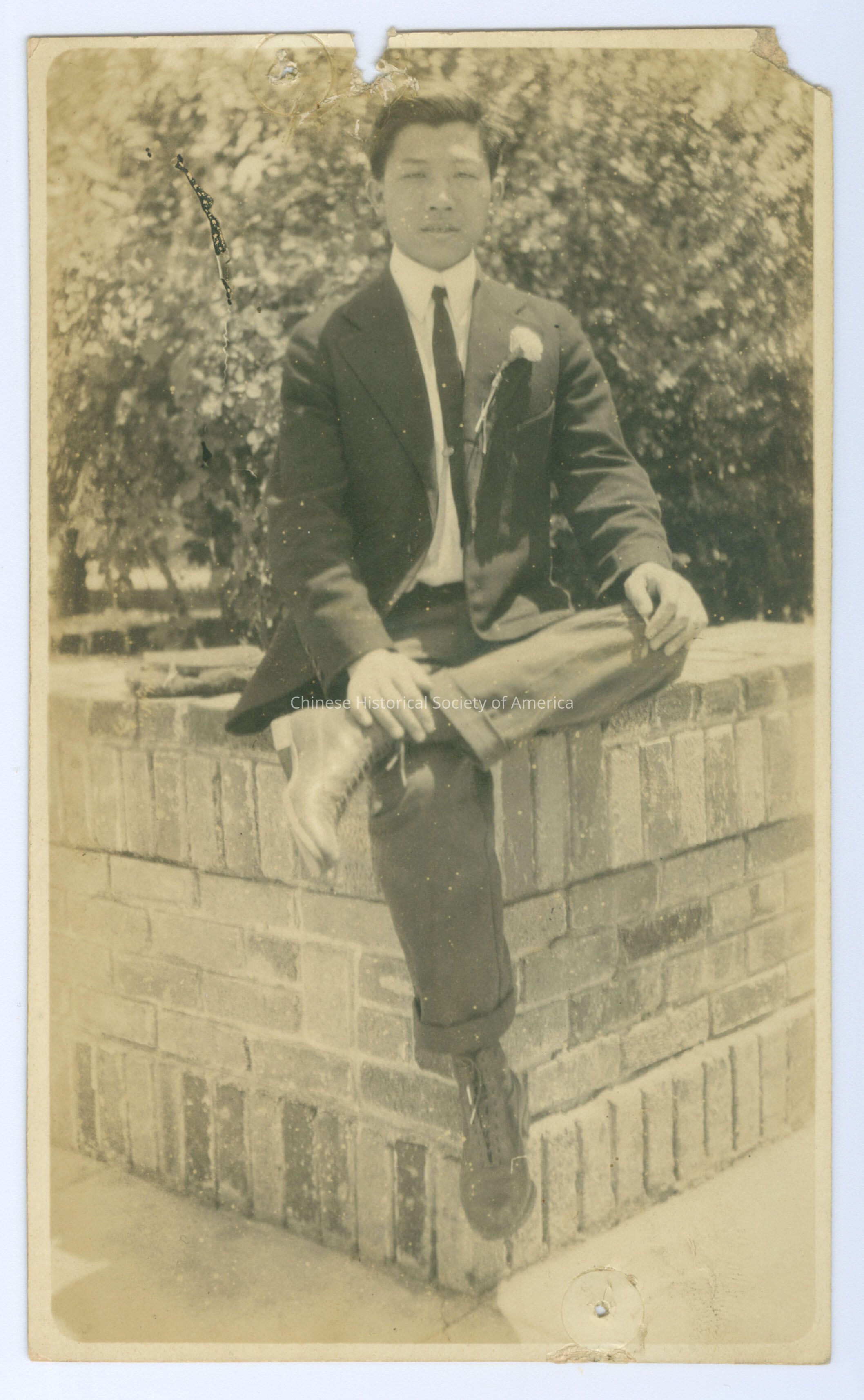 B&W. Photo. Men: A Chinese man in a suit and tie with a flower on his lapel is sitting outside on a ledge with a leg over his knee.