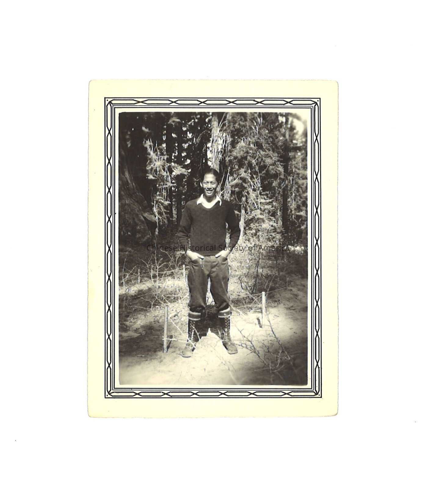 Black and white photo of a Chinese man in knee high boots standing in a forest.