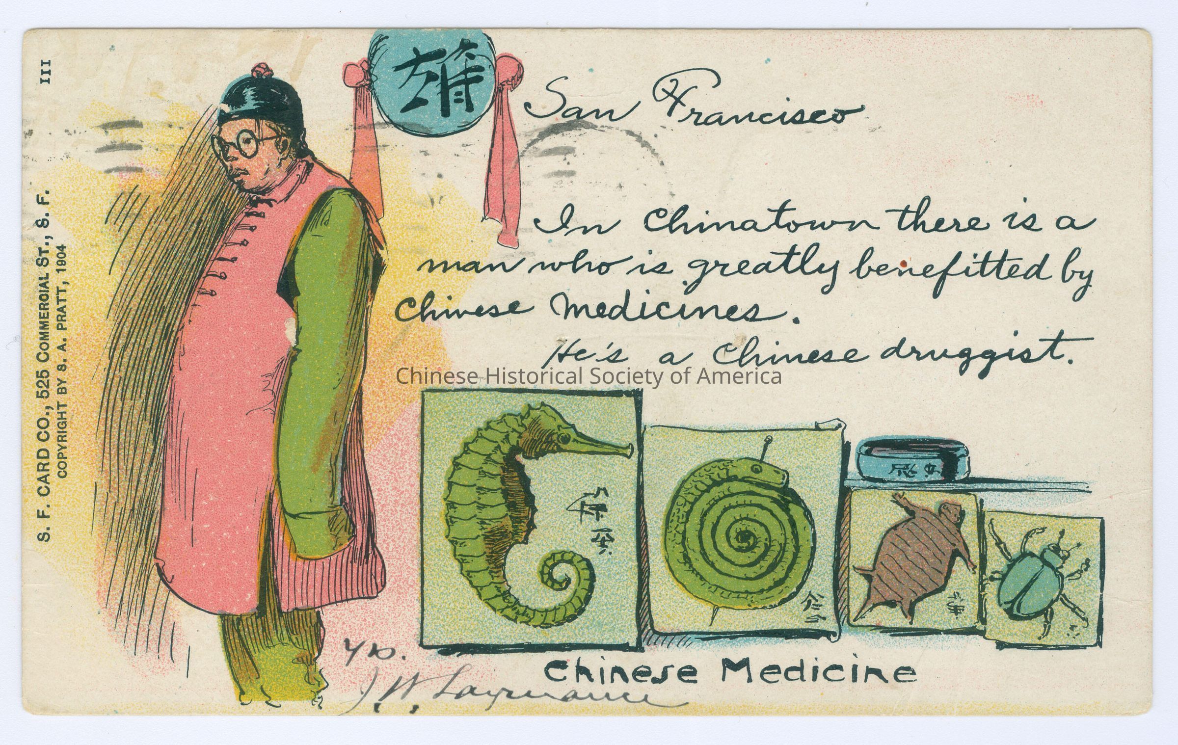 Front: Caption: "San Francisco, In Chinatown there is a man who is greatly benefitted by Chinese Medicines. He's a Chinese druggist. Chinese Medicine." Message: "San Francisco. In Chinatown there is a man who is greatly benefitted by Chinese medicines. He's a Chinese druggist. Y.P. J.W. Laurance," handwritten in black. Left: "S.F. Card Co., 525 Commercial St., S.F. Copyright by S. A. Pratt, 1804." Back: Postmark: "San Francisco, Cal., Jan 18 5-AM 1906." Address: "Mr. A D. Laurance, 229 - 12th St., [illegible], Cal."
