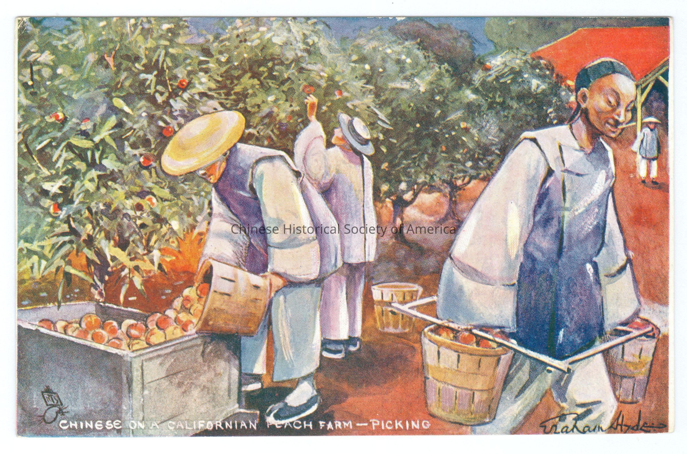 See CHSA-04928-04931. Front: Caption: "Chinese On A Californian Peach Farm - Picking." "Eraham Hyde." Back: "Raphael Tuck & Sons"; "Oilette"; "Reg'd Postcard 6458." Old Accession #: E)-