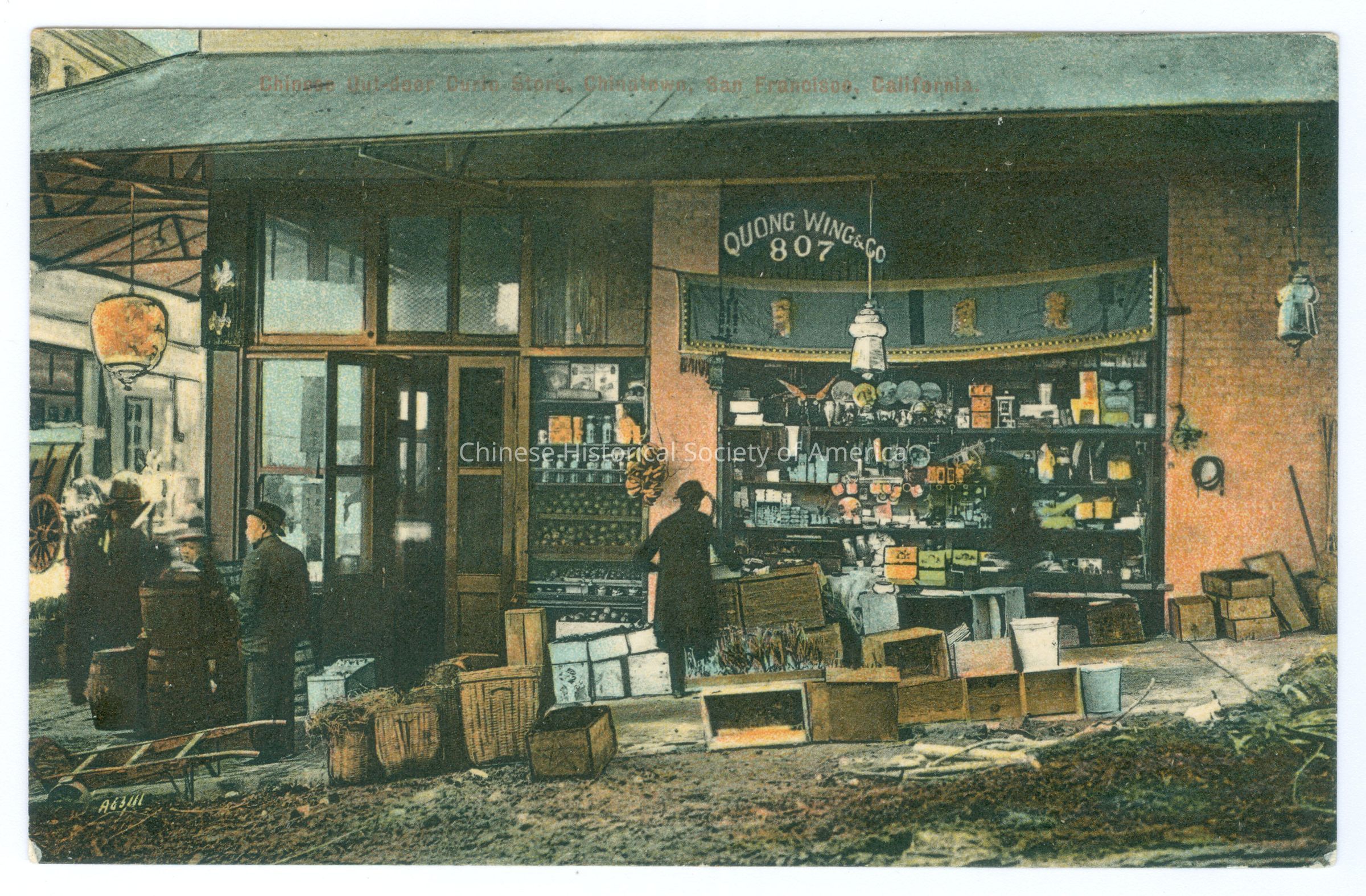 Color. Photo. SF; Local Industry; Market: View of a corner store where the signs says "Quong Wing & Co. 807", there are goods lines up on the wall, there are barrels stacked up and crates and baskets on the sidewalks.