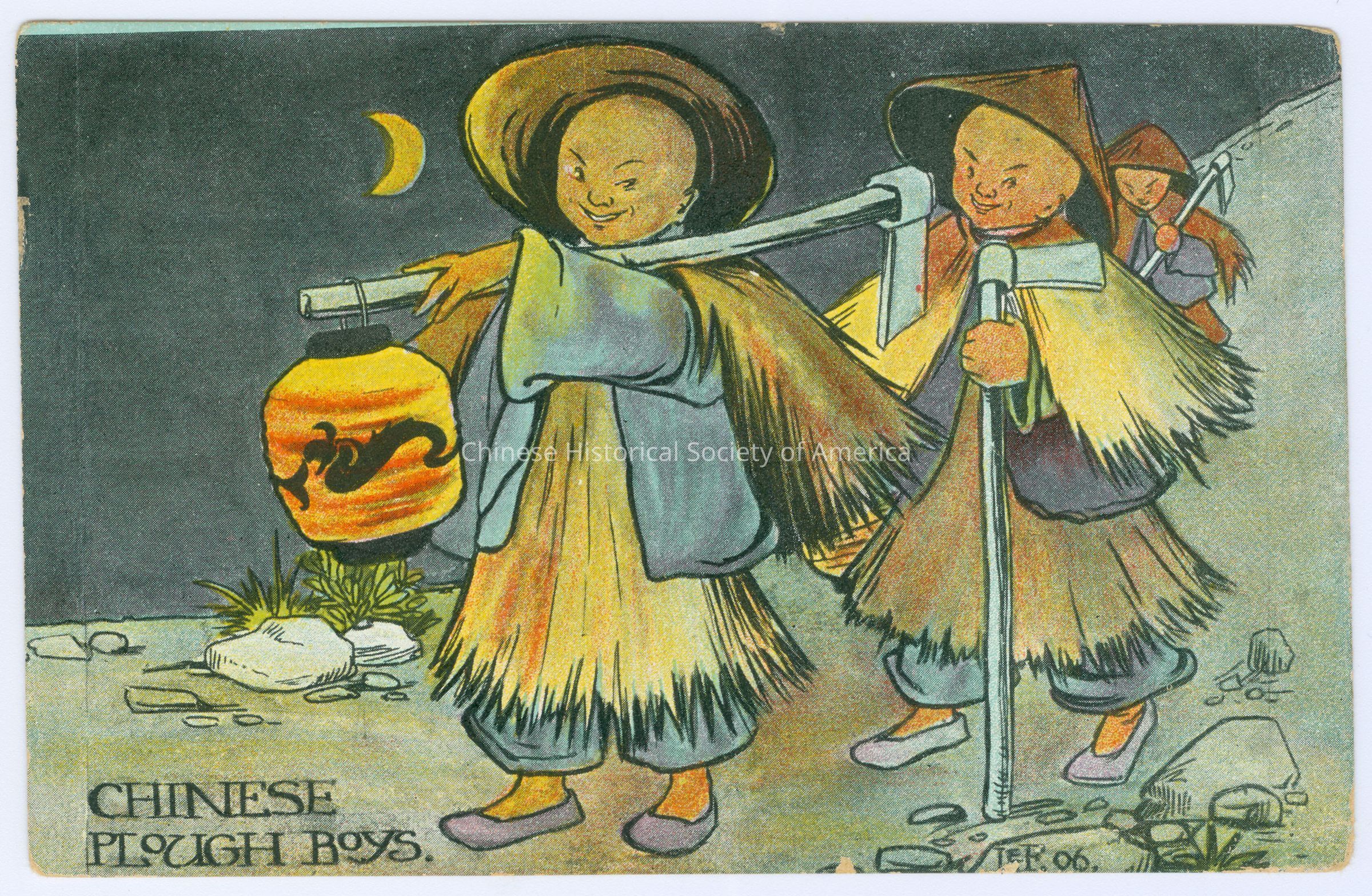 See CHSA-04922-04926. Front: Caption: "Chinese Plough Boys." "LEF.060." Back: Postmark: "Chicago, Ill. Jun 11 1909 7:30 PM", stamped in black. Stamp: A green one cent stamp with a side picture of Benjamin Franklin, "U.S. Postage, One Cent." Address: "Mrs Yohn ___, Leigh Neb." handwritten in black. Message: "_________" handwritten in black. Old Accession #: I)-