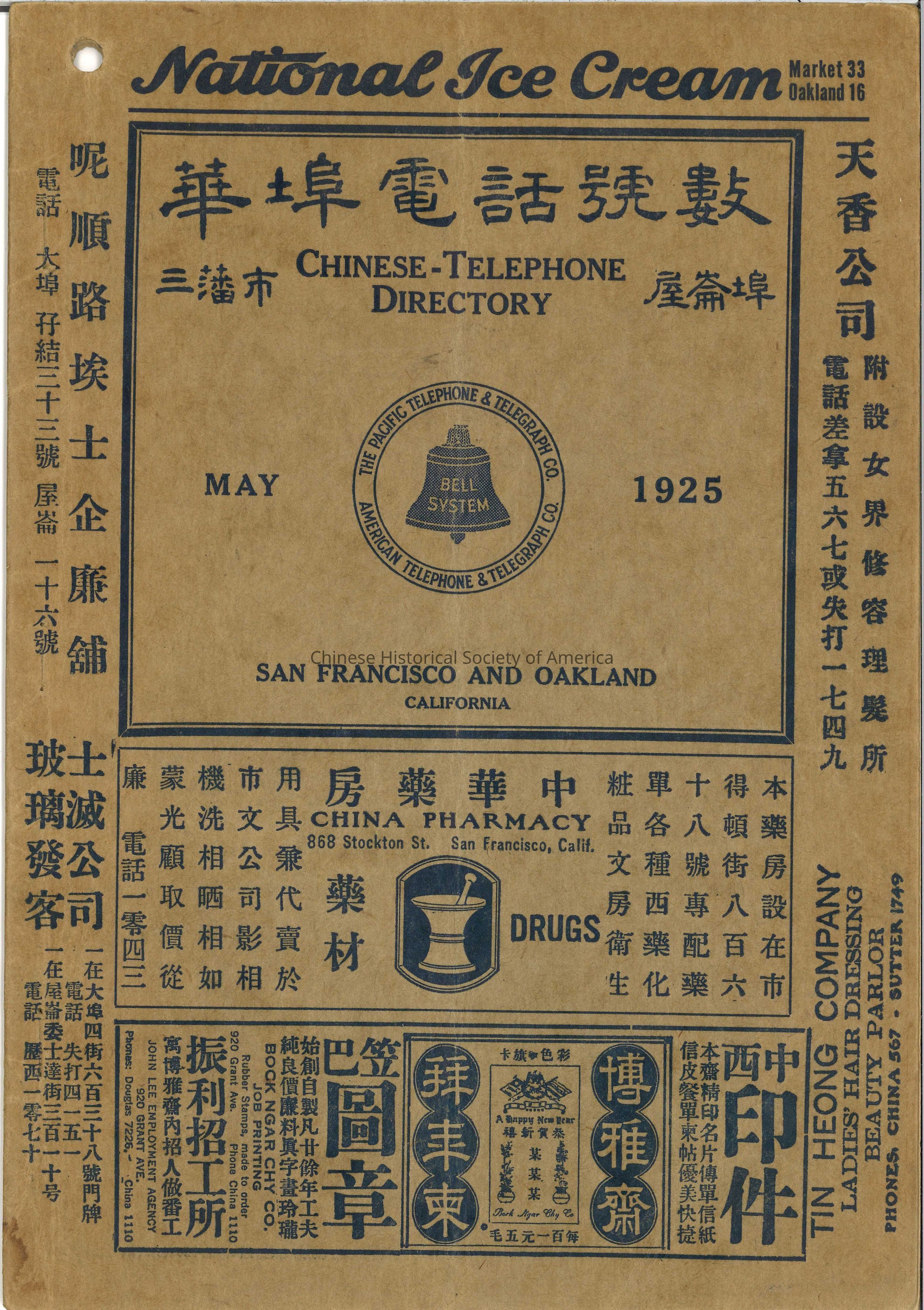 Chinese-telephone directory May 1925 San Francisco and Oakland California; published by the Pacific Telephone & Telegraph Co. and American Telephone & Telegraphy Co.