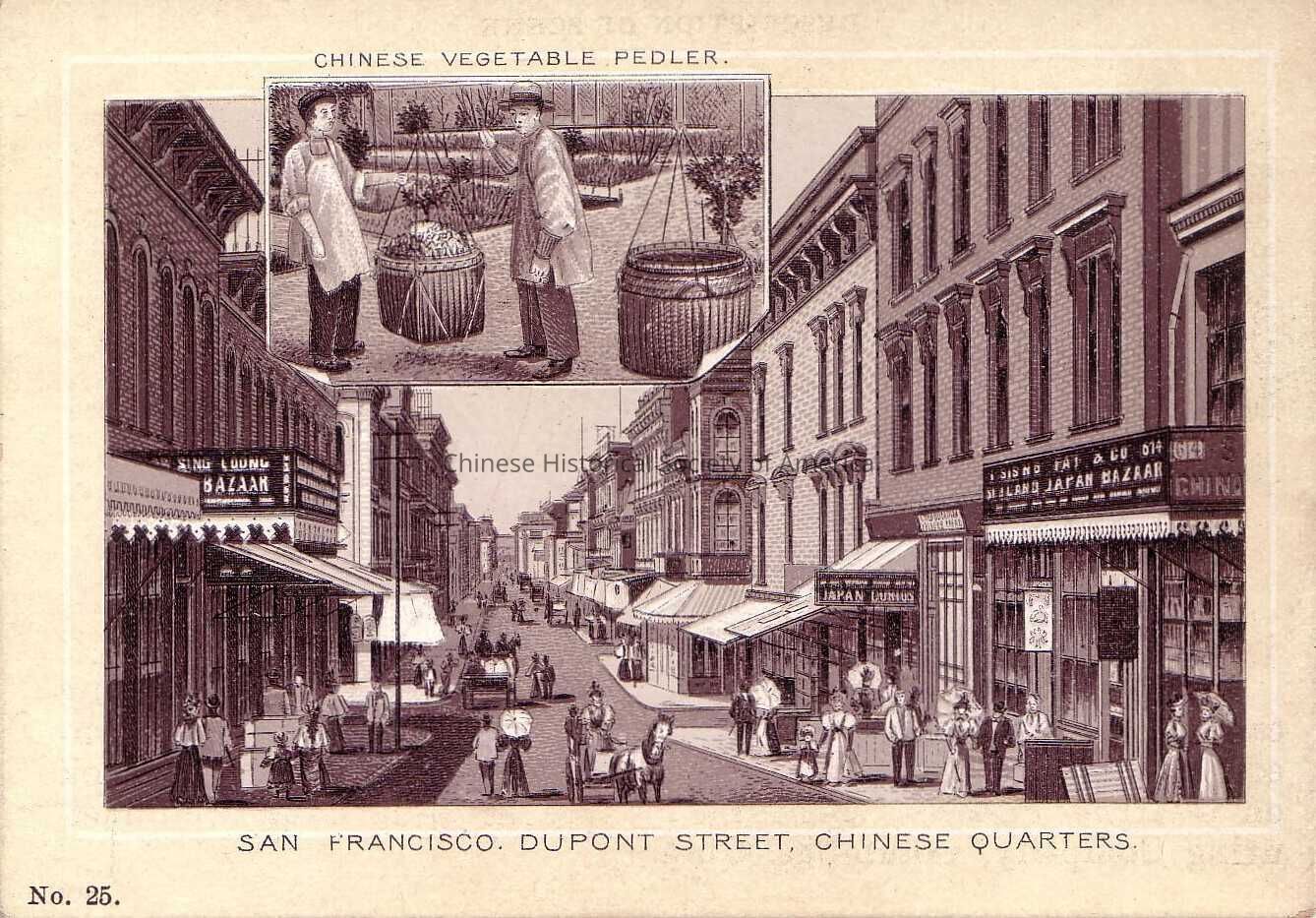 Front: In this tradecard one can find a black and white illustration of a Chinatown street scene in the early 1900's.The main focus of this illustration looks at Dupont Street (now Grant Avenue) and what it looked like during the Victorian age. Here we can see storefronts and brick-layed streets where a horse is pulling a buggy and its passengers. Women walk around with their umbrella and often are escorted by men wearing suits. Near the upper left hand corner is an inserted picture of a "Chinese Vegetable Pedler." In this picture of two vegetable peddlers, one of the men is balancing two baskets on a stick, while the other looks over the merchandise. On the outside white border of the tradecard is the following notation: No. 25. and San Francisco. Dupont Street, Chinese Quarters