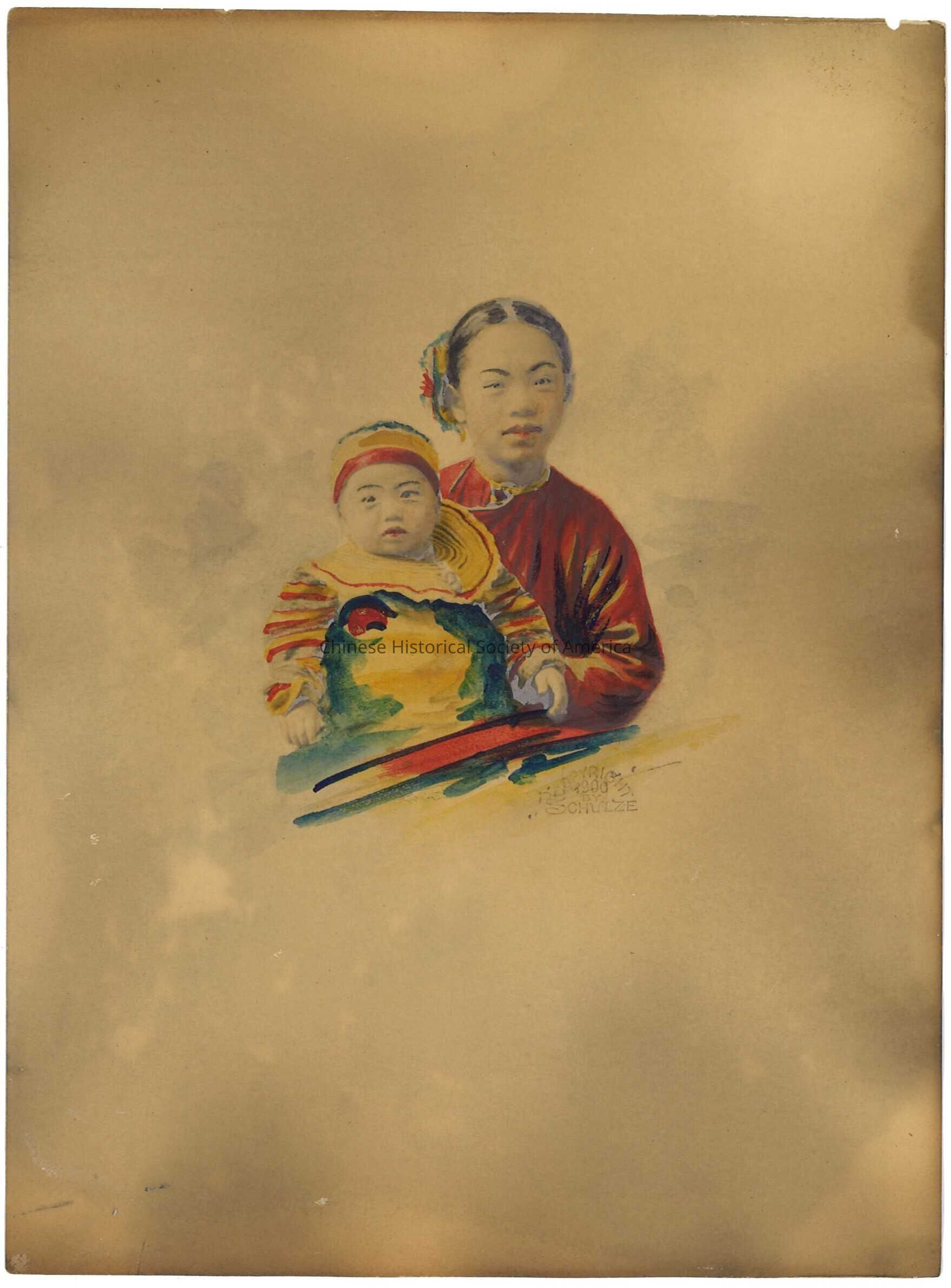 Hand colored print of Chinese woman and child in San Francisco Chinatown by Hortense Schultze.
