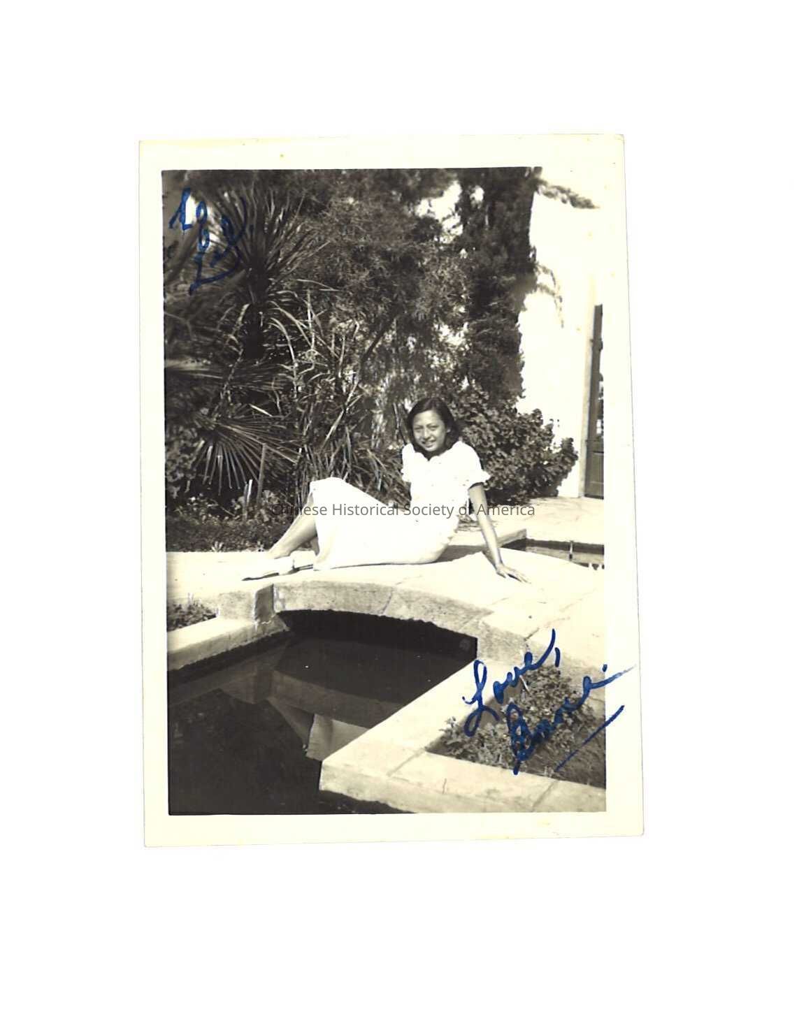 Black and white photo of a Chinese woman wearing all white sitting on a concrete bridge over a pool.