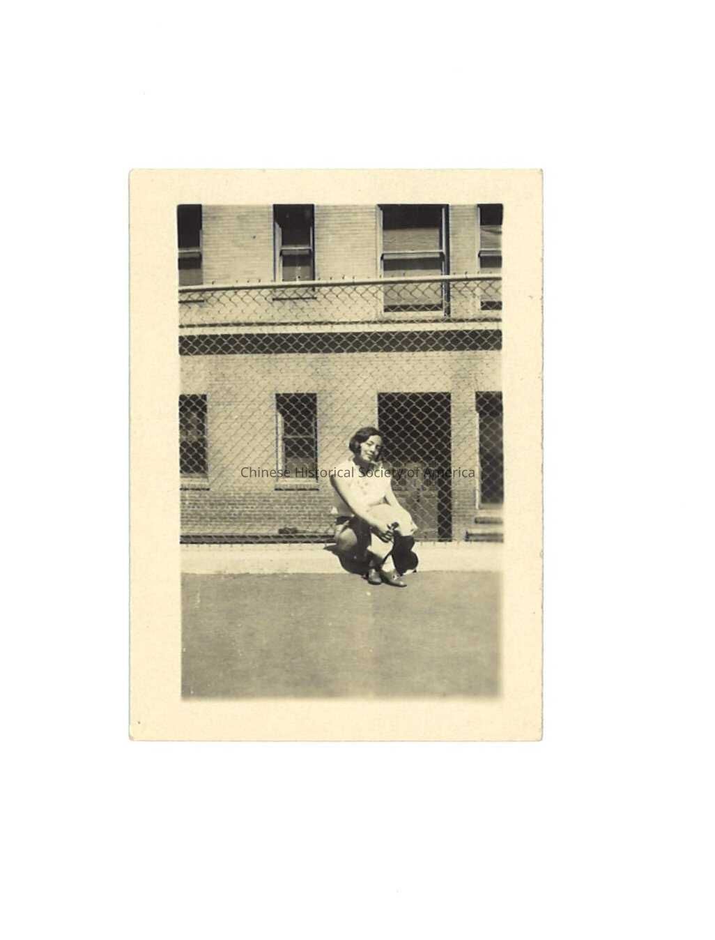 Black and white photo of a Chinese woman sitting in front of a chain link fence.
