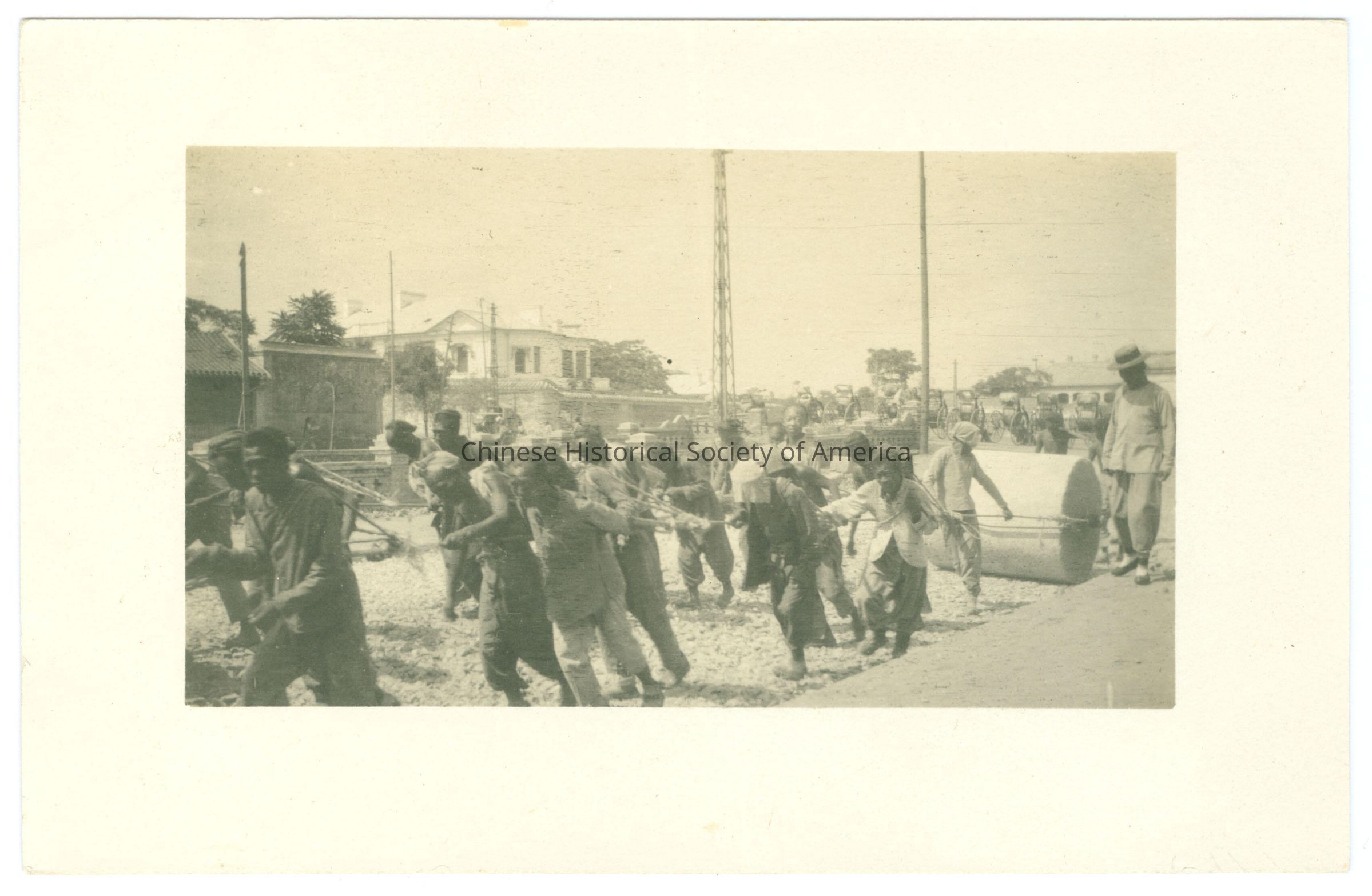 B&W. Photo. Local Industry; Coolies; Paving the Road: A group of Chinese workers with queues are pulling a large roller over an unpaved raod while another Chinese man in a hat is supervising, in the background are parked rows of ricksaws.