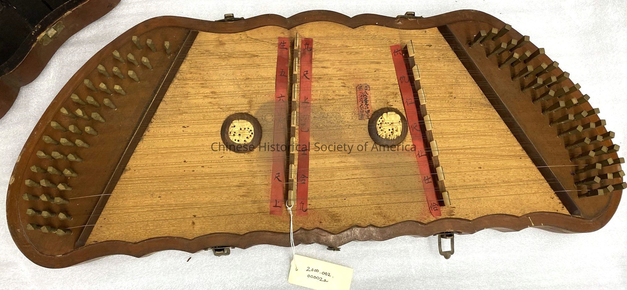 Chinese yangqin (hammered dulcimer or butterfly harp). Instrument is composed of a wooden trapezoidal soundboard with 14 rows of 3 metal tuning pegs placed upright on both left and right sides. Attached to the pegs and the stretching lengthwise across the soundboard are 38 metal strings, coupled in groups of three over two bridges. Three strips of red paper, each with seven handwritten Chinese characters indicating different pitches, are placed in line with the two bridges. To the left of each bridge is a small circular ivory carving of a bird and plants inside a wooden ring. In the middle of the soundboard is a small red paper label filled with Chinese characters. Four metal latches (two on either side of the instrument) attach an accompanying lid to the yangqin. Between the two latches on the front is a small drawer with a decorative metal pull tab handle. Inside the drawer is a small brass-colored hammer-shaped tuning key. This Butterfly harp is the older of the two HJ donated to CHSA.Material
