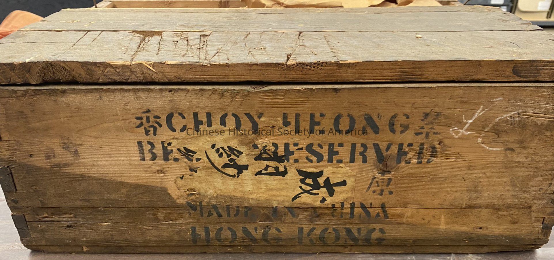 One side of the crate reads, "Choy Heong/Be [Pr]eserved/Made in China/Hong", another side reads, "6 Jars Ginger", and another side of the crate reads, "SF CAL CHIN". Choy Heong made and sold preserved ginger, and exported to the US, as early as the 1920s. Inside are brown-paper wrapped bundles of salmon colored gauze fabric and one package of fuschia colored fabric.