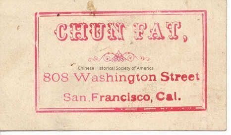 Front: A rectagular business card is printed in red and the following is enclosed within a double red line border. Chun Fat, 808 Washington Street San Francisco, Cal.