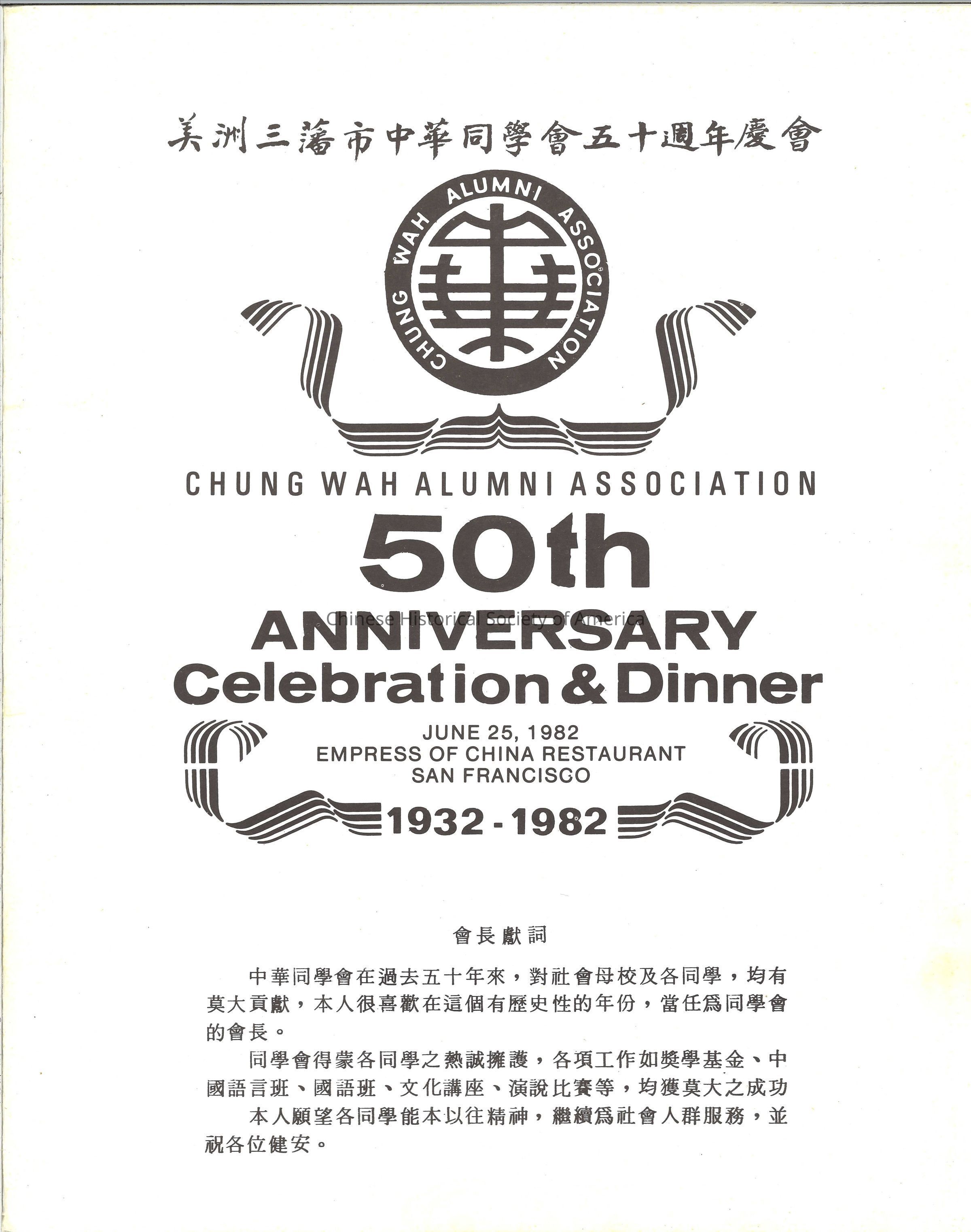 Chung Wah Alumni Association 50th Anniversary Celebration & Dinner on 25 June, 1982 at Empress of China Restaurant San Francisco (Content in Chinese)