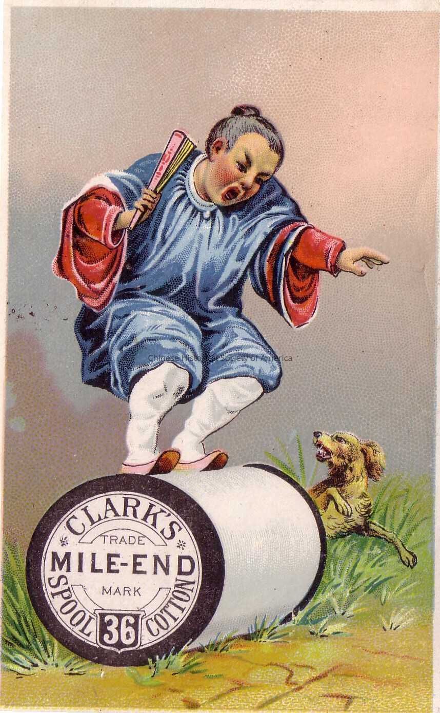 FRONT: A Chinese woman wearing a blue and red robe and white pants, w/ her hair in a bun, is holding a fan while she balances on top of a giant spool of white thread with the label "Clark's Mile-end Trade Mark Spool Cotton." A small brown dog is running alongside the giant spool and looking up at the woman.