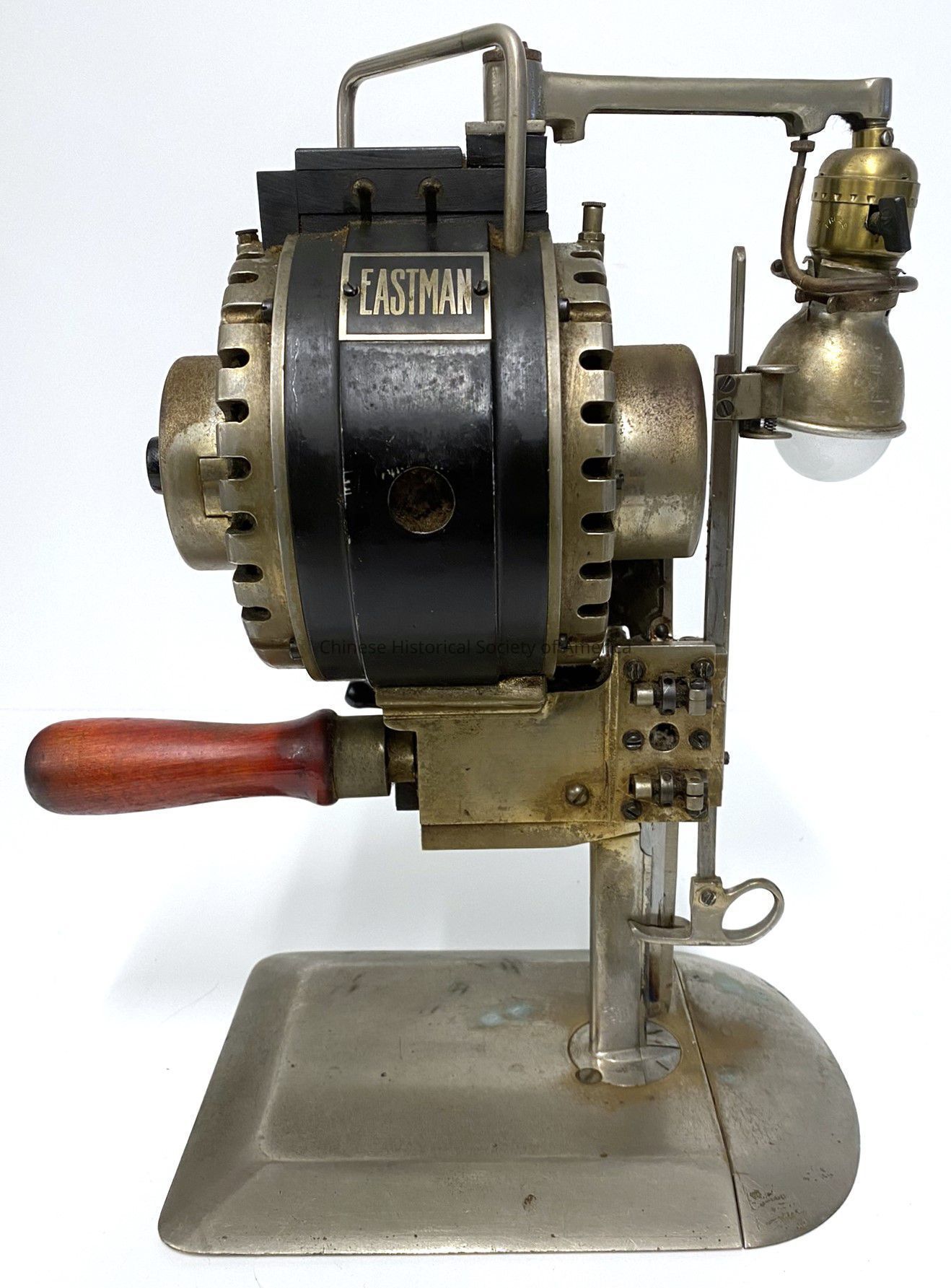 Cloth cutting machine, made by Eastman, in Buffalo, New York. It was patented between January 19, 1909 and January 15, 1918. This one is rare, in that it has a lightbulb attachment. Patent #14181. 110 Volts. 60 Cycles. 3 Amps. Two fabric covered electrical cords come with it.Context