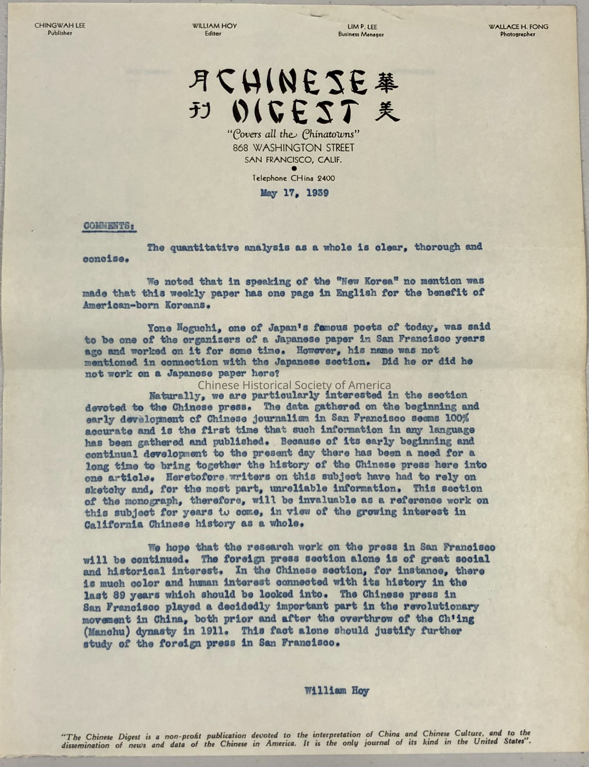 Blue carbon copy on Chinese Digest letterhead