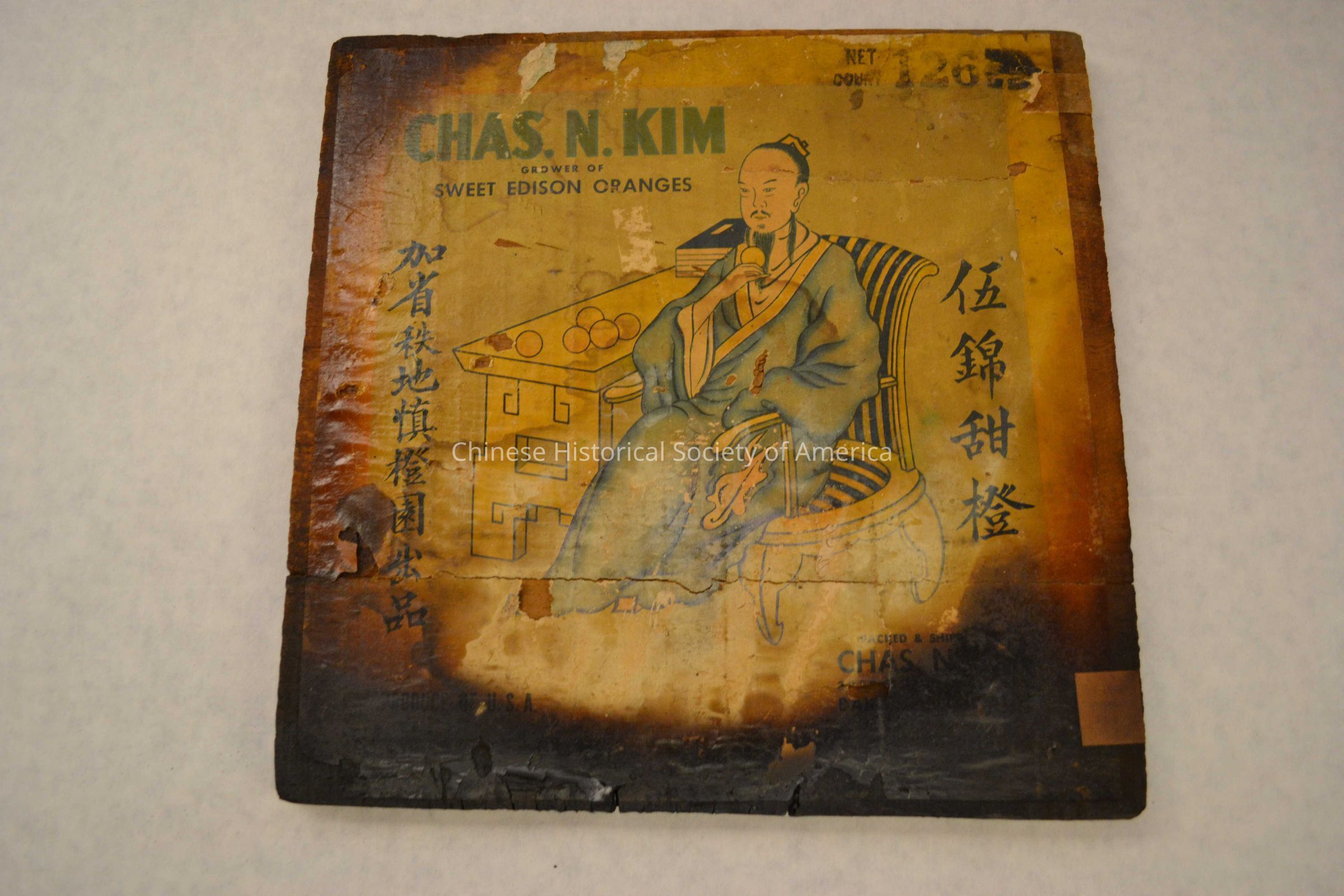 "Chas N. Kim was born in San Francisco (circa 1882), and moved to Kern county in 1900 to work as a cook at the N.P. Peterson farm. Six years later he came to Bakersfield, and in 1908 was employed by Standard Oil to supervise cook houses at Taft. He later engaged in the hotel business and was active in civic affairs of the large Chinese community which grew up on the West Side in the early (19)20s. He farmed at Dinuba and in the Cuyama Valley before returning in the late (19)20s to become a citrus grower in the Edison area. He developed the famous brand of Chas N. Kim Oranges which he distributed throughout the United States, and exported to Hong Kong and the Philippines." -from Newspaper Archive, Article clipped from Bakersfield Californian, dated Tue, Feb 06, 1962