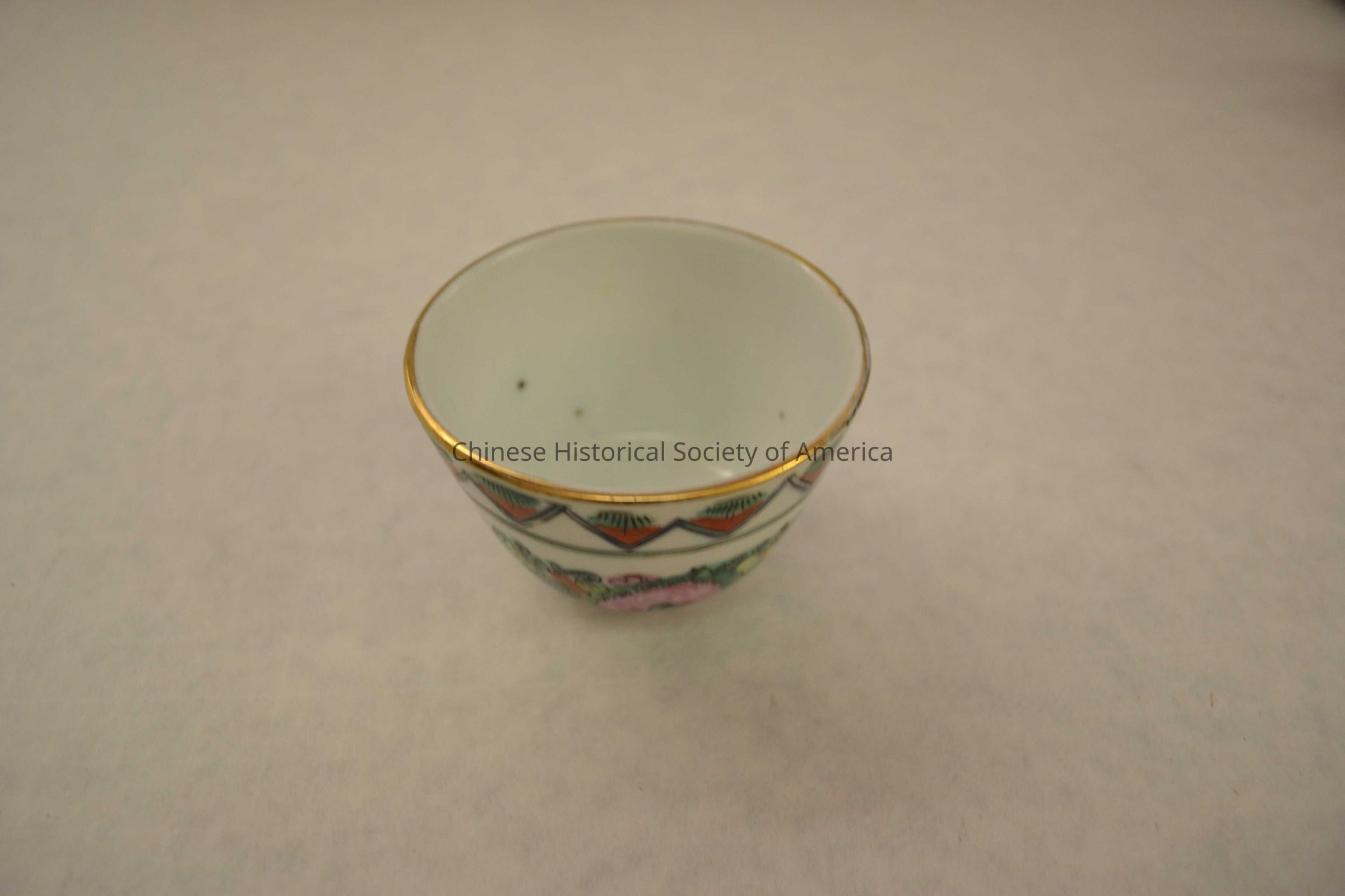 Porcelain enamel-painted Famille Rose cup with flowers, red and green triangles around gilded rim. 合利隆製 "Made by Hop Lee Long" on bottom. Canton export porcelain