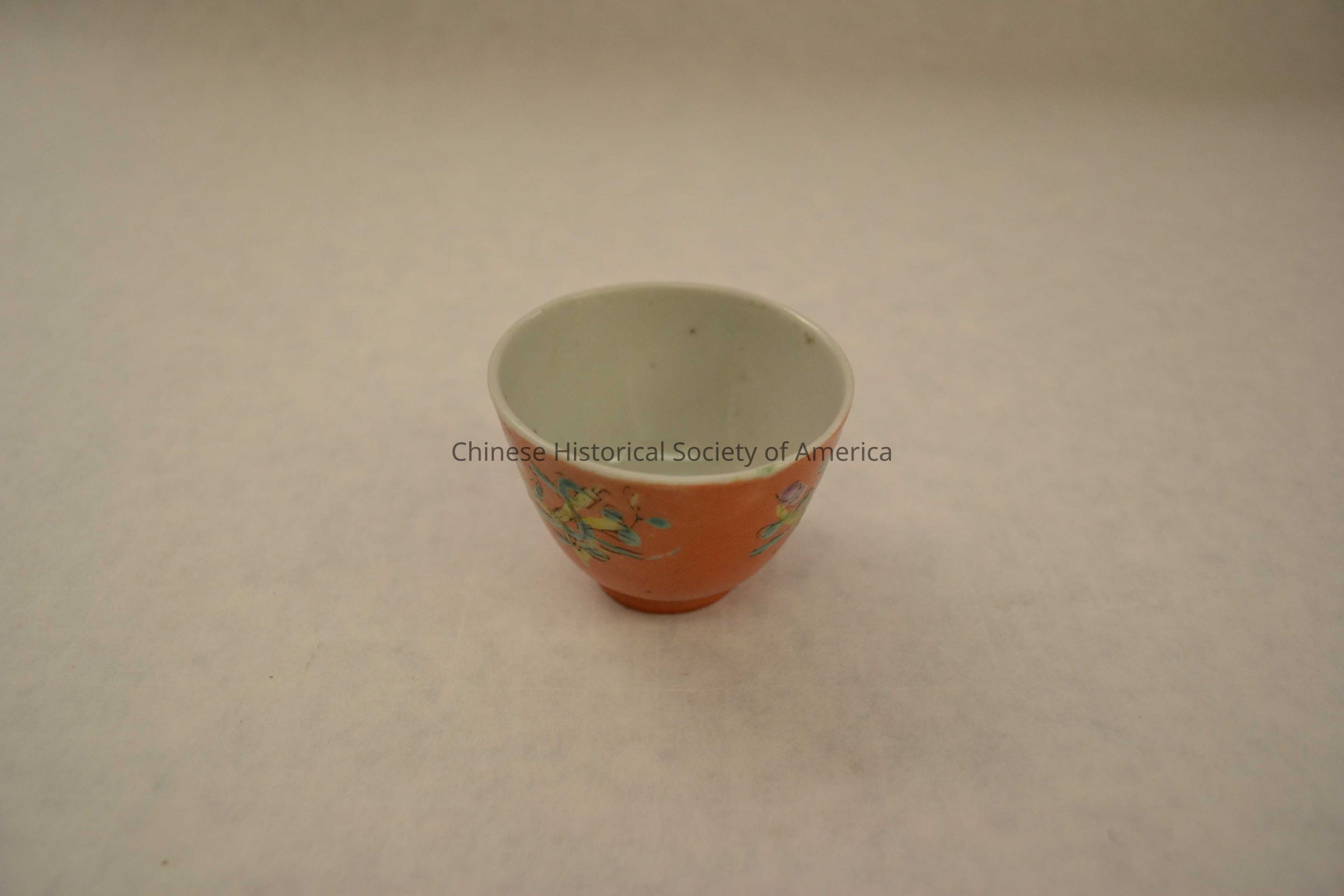 Porcelain enamel-painted coral-ground cup with bamboo flute and flower pattern; Chinese knot on bottom. Canton export porcelain.Context