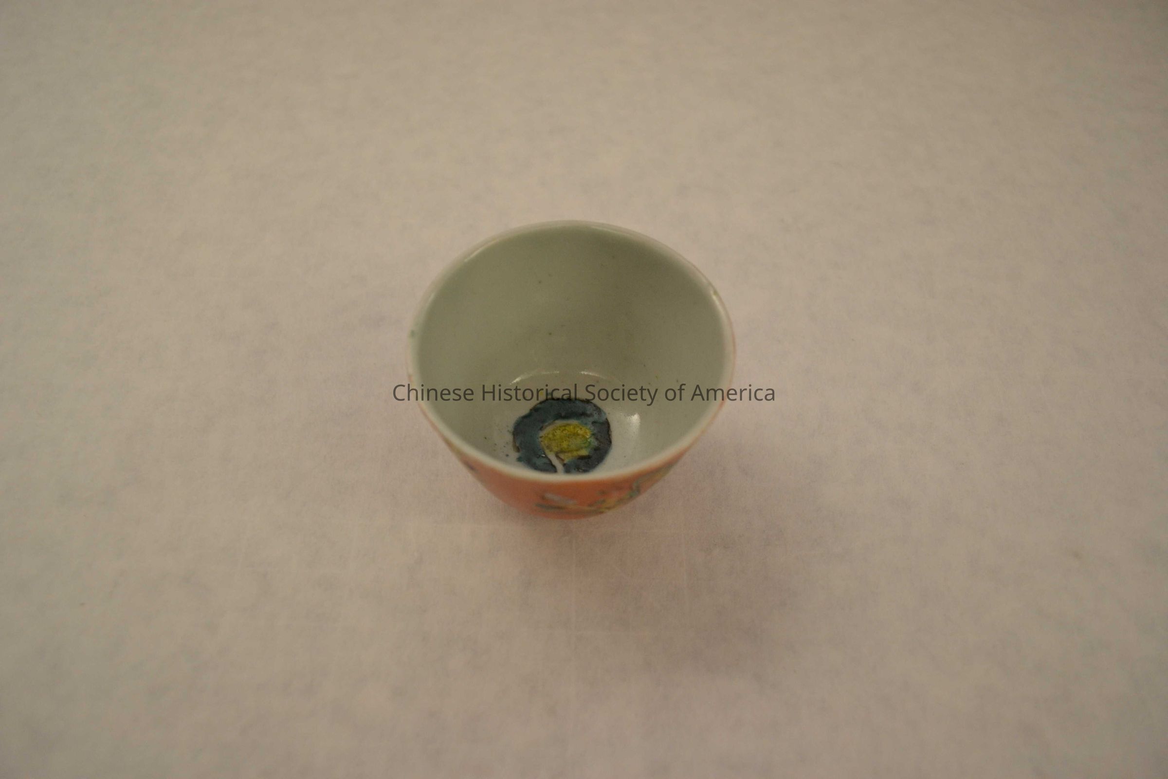 Porcelain enamel-painted coral-ground cup with bamboo flute and flower pattern; painting inside cup, possible Chinese knot on bottom. Canton export porcelainContext