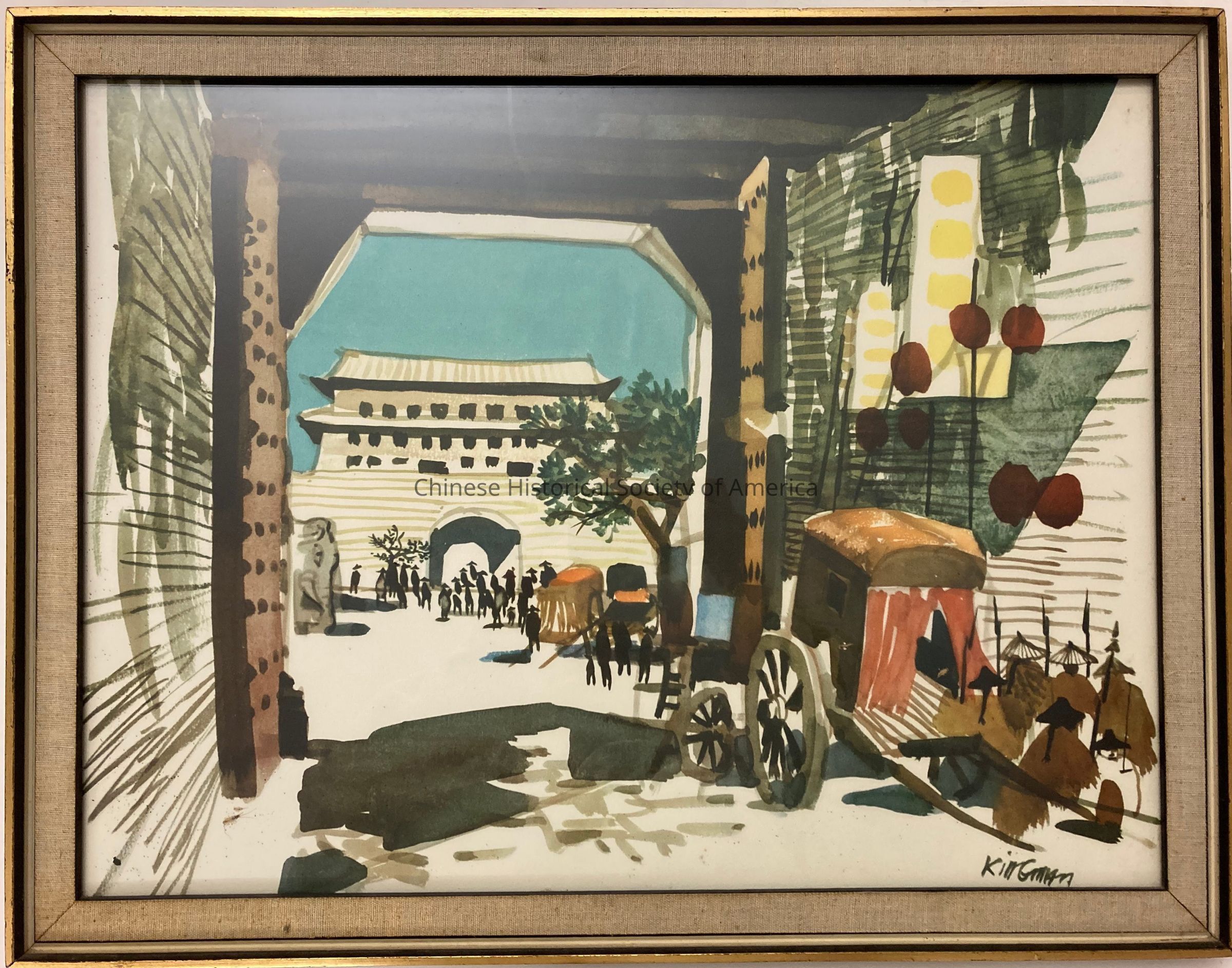 "Busy gateway to the walled city of Peking during the time of the Boxer Uprising, as painted by Dong Kingman during the filming of the Samuel Bronston production, "55 Days in Peking," starring Charlton Heston, Ava Gardner, and David Niven."Dimensions