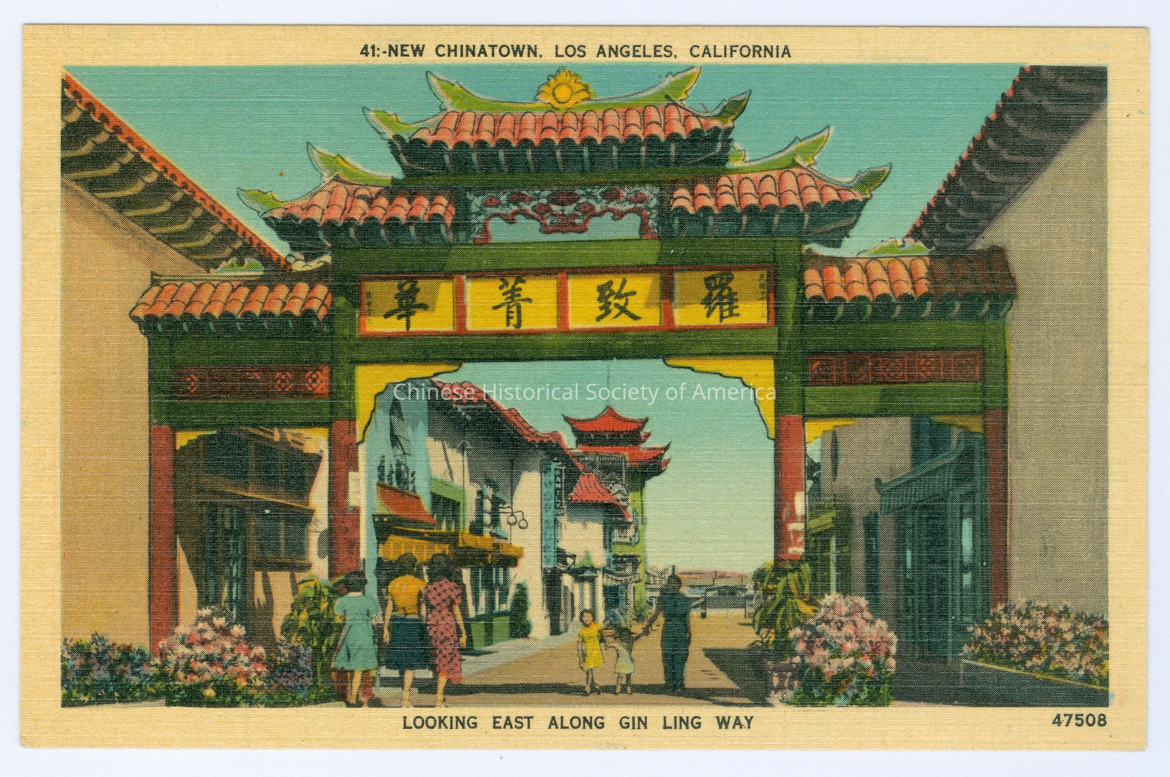 Front: Caption: "41:-New Chinatown, Los Angeles, California, Looking East Along Gin Ling Way 47508." Back: Info. Text: "New Chinatown, New Chinatown's is one of the big attractions in Los Angeles and is visited by thousands annually. Here can be found tempting Chinese food served in an atmosphere of old China itself, as well as delightful gifts and rare jewels usually to be procured only in the Orient". Old Accession #: GAE