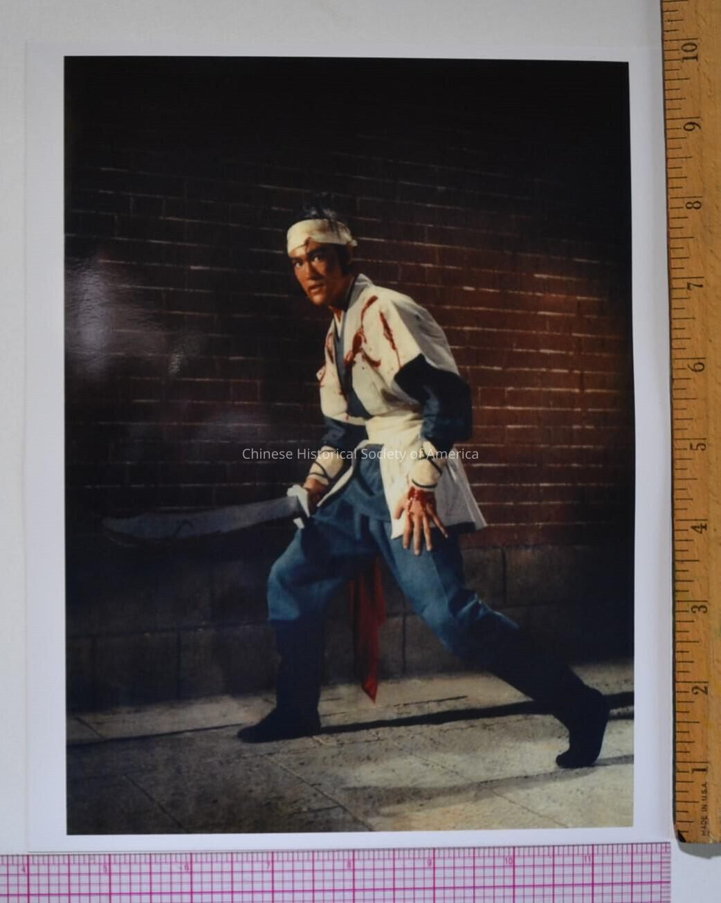 Bruce Lee wearing costume and holding a sword with legs spread apartContext