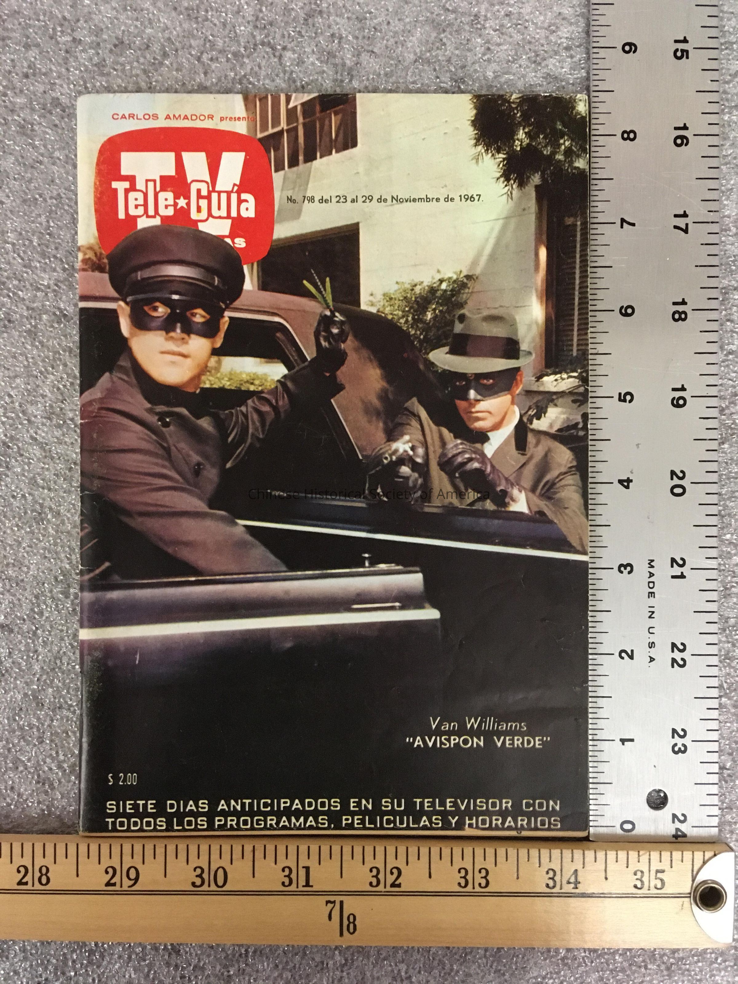 "TV Tele Guía" at the top left corner of the front cover, Bruce Lee and Van Williams in Green Hornet costume on the cover; "B20" noted at the top right corner of the back cover.Dimensions