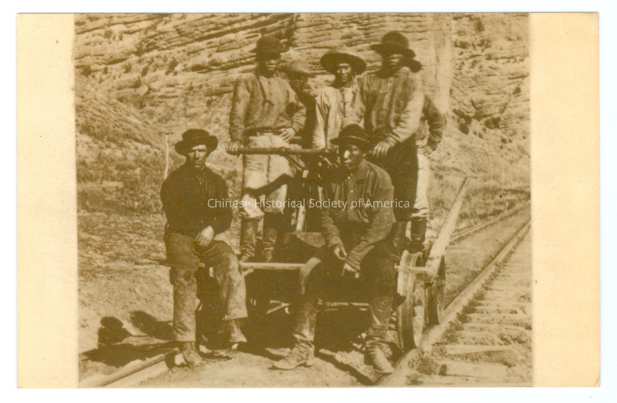 B&W. Photo. Railroad: 5 Chinese men in hats and pants are standing on a manuel railroad car, another Chinese man is sitting on the front of the car and a White man is sitting too.