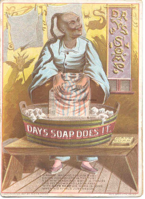 Front: An Orientalised depicted Chinese woman is portrayed w/ dark skin and a queue. He can be found washing clothes in a wash bin with an advertisement that states: "Days Soap Does It." A sign in Chinese characters can be found on the right, with towels hanging in the background.