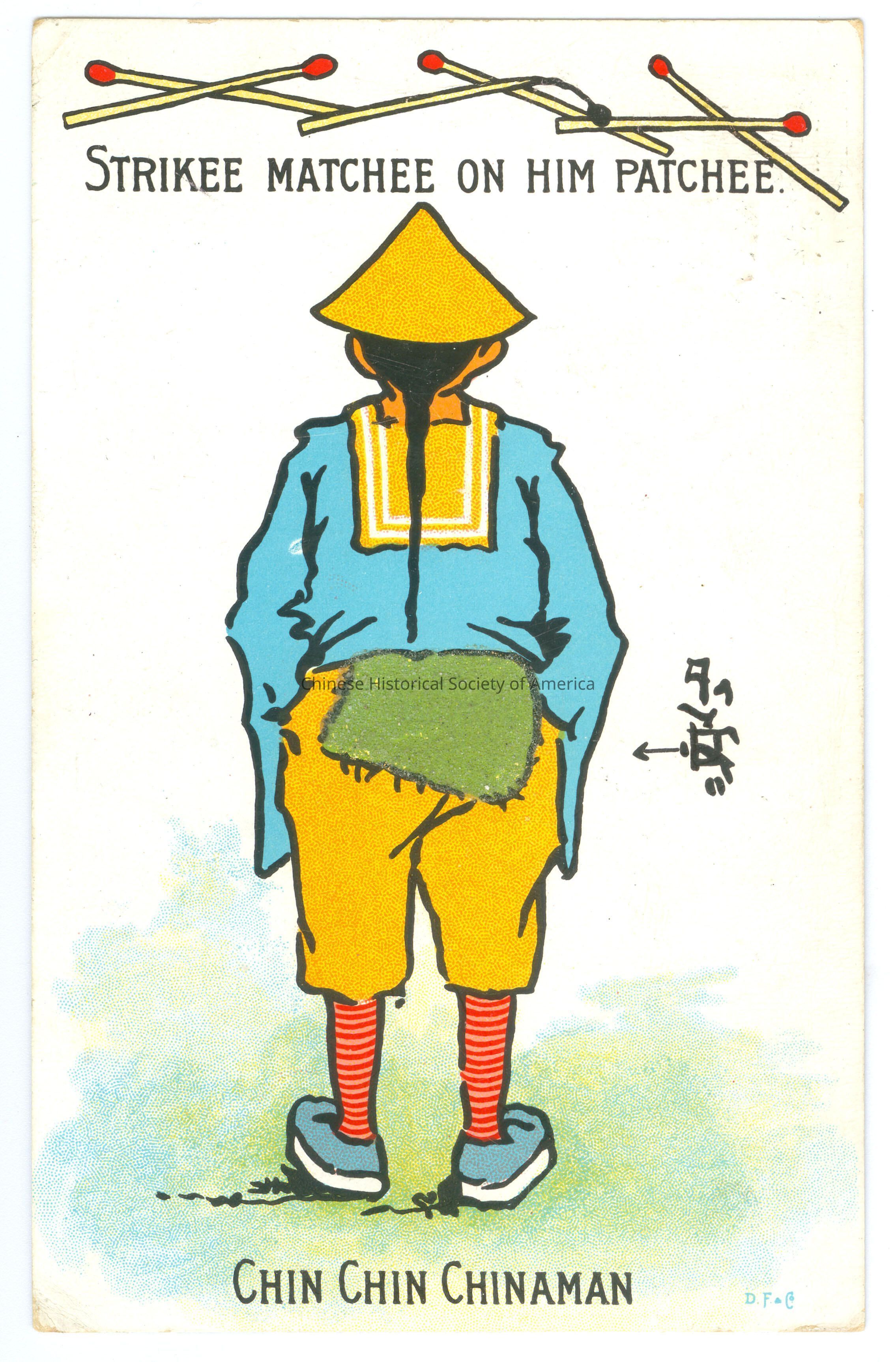 Color. Illus. Caricatures; Chinese Men: The back of a Chinese man, he is wearing a straw hat with a queue down his back, he is wearing a blue shirt with yellow pants and large green patch on it, he has on red striped pants with hands in his pockets.