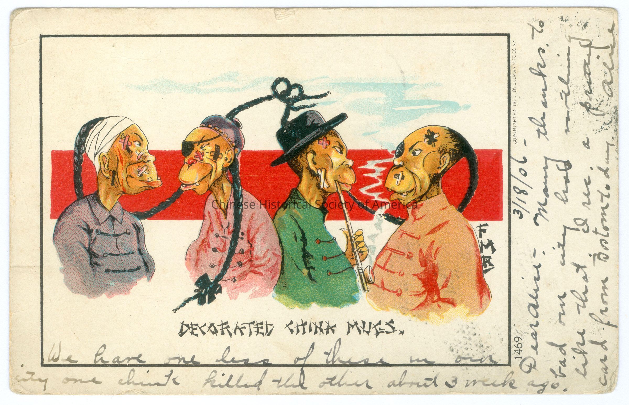 Front: Caption: "Decorated China Mugs. 1469" Message: "3/18/06 - Dear Alice - Many thanks too bad our city has nothing like that. I rec. a pretty card from Boston today. We hope one less of these in our city one chink killed the other about 3 weeks ago." "Copyrighted 1905 By Ullman MFG. Co. NY." Back: Postmark: "Quincy Ill. Mar 17 1906 10 PM". Stamp: A green one cent stamp with a picture of Benjamin Franklin. Addressee: "Alice Jumper St Louis Mo. 2344 Clark Ave." Old Accession #: PEX
