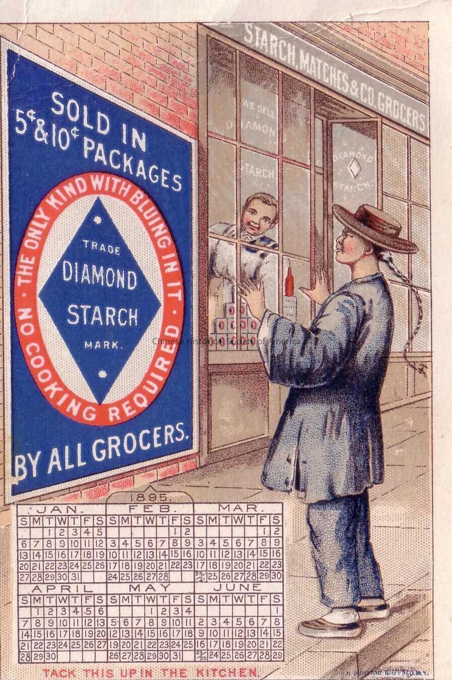 Front: A Chinese man wearing a traditional Chinese outfit, but with a western style hat over his queue, is standing in front of a Starch Matches and Company grocery store while he observes an advertisement poster for the new Diamond Starch. A Caucasian man watches the Chinese man behind a glass window. At the lower left hand corner there is also an 1895 calendar for the months of Jan through June with the words "Tack this up in the Kitchen" below it.