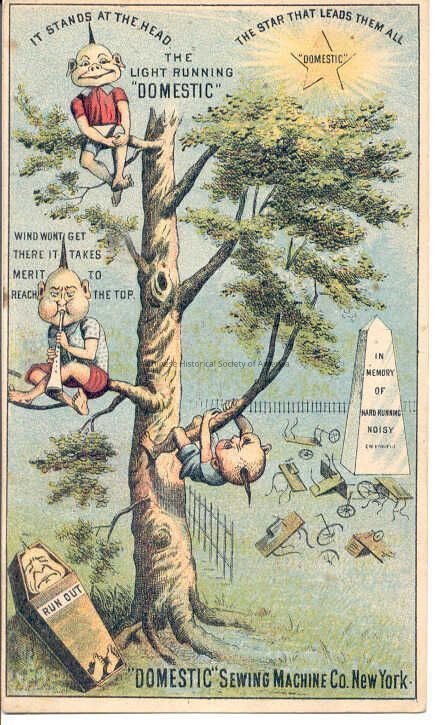 'Front: Three "Brownies" or Orientalised Asian boys with queues are playing and climbing a sparsely covered tree with few branches and leaves. A fourth "brownie" is laying inside an open coffin near the foot of the tree. This scene takes place in a graveyard and in the background there is a tall white building. Written on the lower right hand corner is the following: "Domestic Sewing Machine Co. New York."