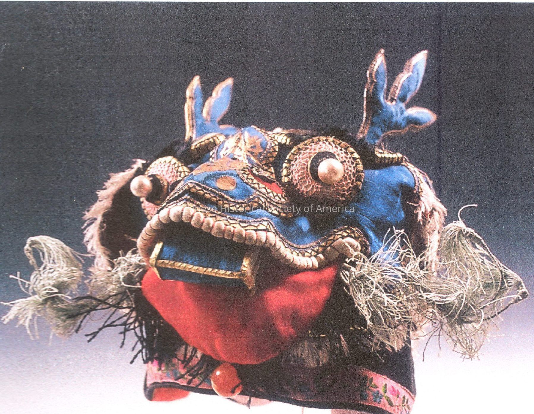 Black silk hat overlaid with a blue silk dragon with padded horns, painted applied snout and wired silk whiskers. See additional notes about description and interpretation.Context