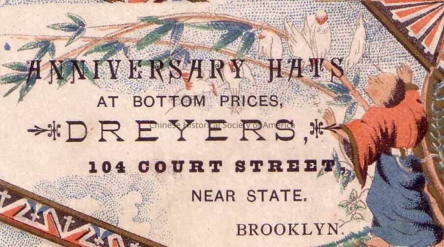 Front: A man wearing a red shirt and a blue skirt attached by a white belt is standing on the lower right hand corner as he glances up at six doves sitting on top of a bamboo tree. On the upper right hand corner is a brown, white and red design and near the bottom is a stripe of border in the same colors. The advertisement for the tradecard is stamp in the middle and it is for the following: